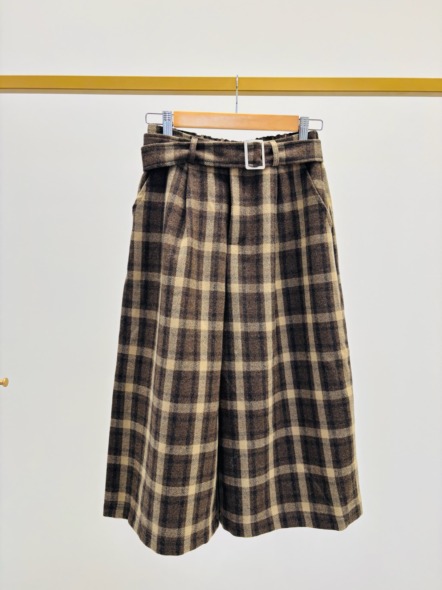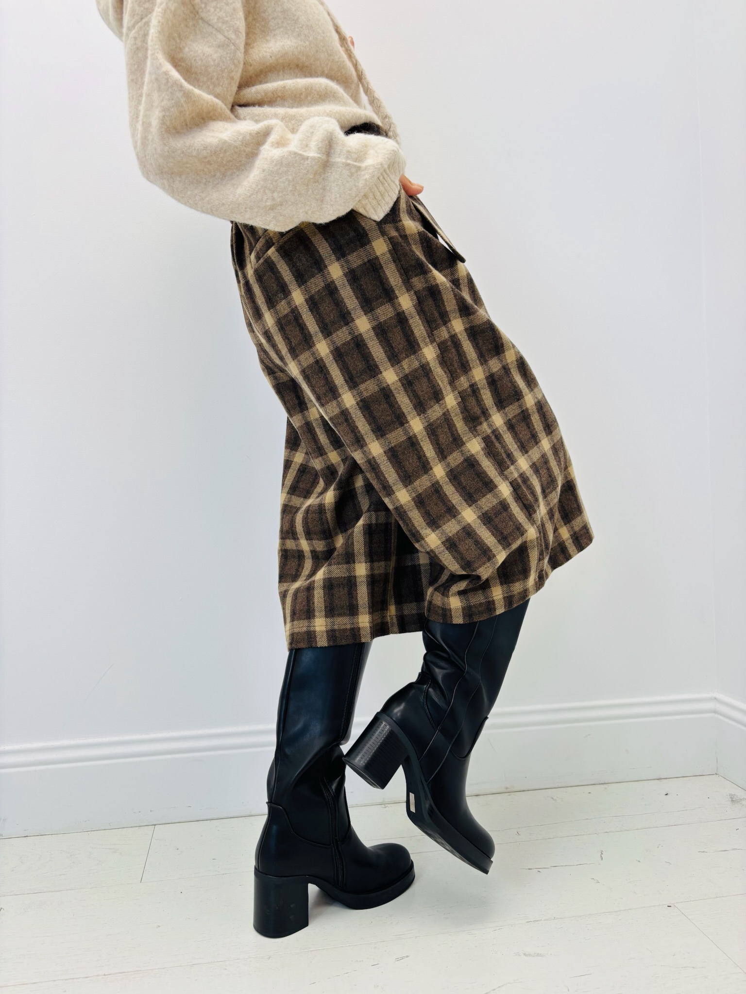 Sa matière douce à carreaux lui donne un charme rétro inspiré du tailoring anglais, tandis que sa ceinture assortie avec boucle souligne joliment la taille.