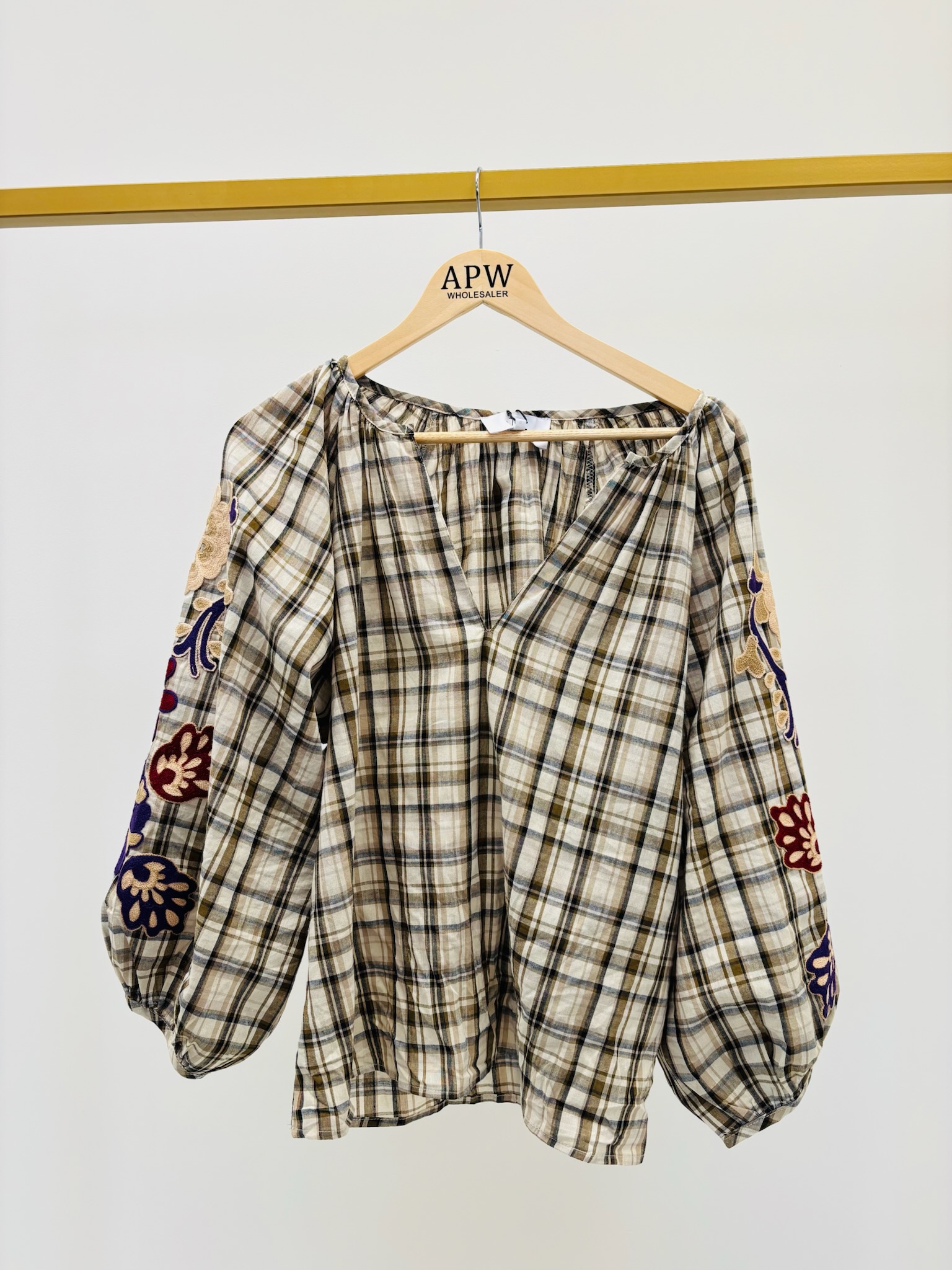 Blouse à Carreaux & Manches Brodées – 100% Coton