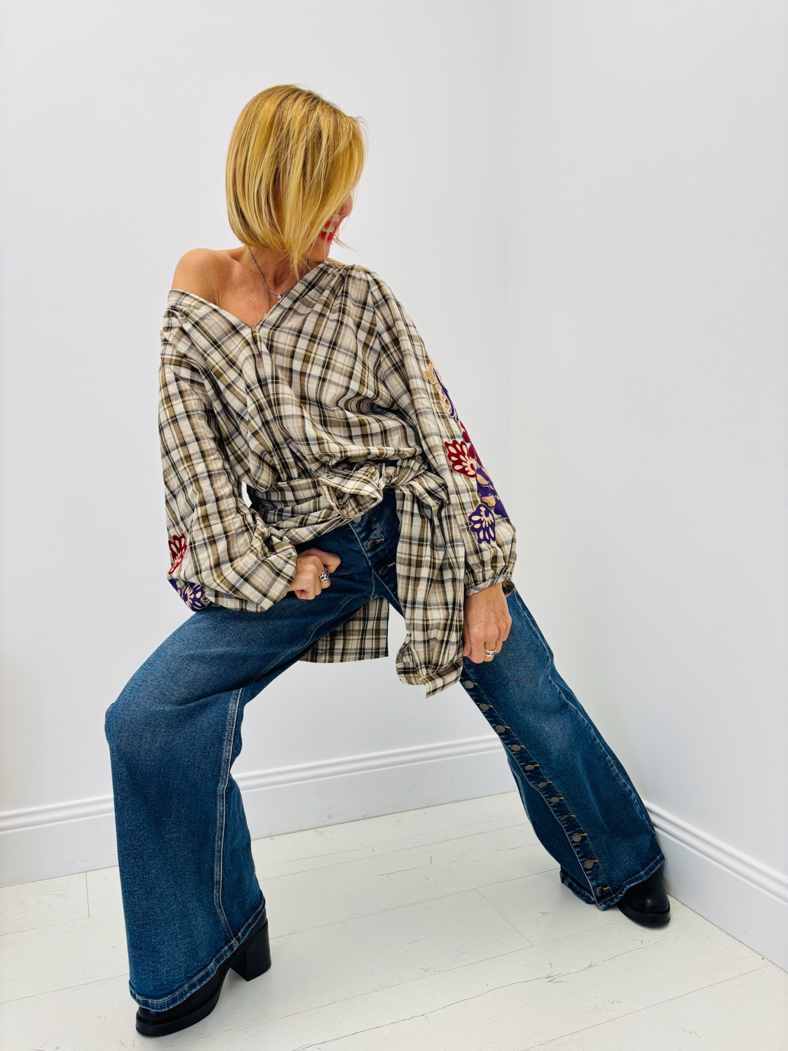 Cette blouse à carreaux revisite le style bohème avec une touche moderne grâce à ses manches richement brodées. Confectionnée en 100% coton, elle est légère, agréable à porter et parfaite pour toutes les saisons.