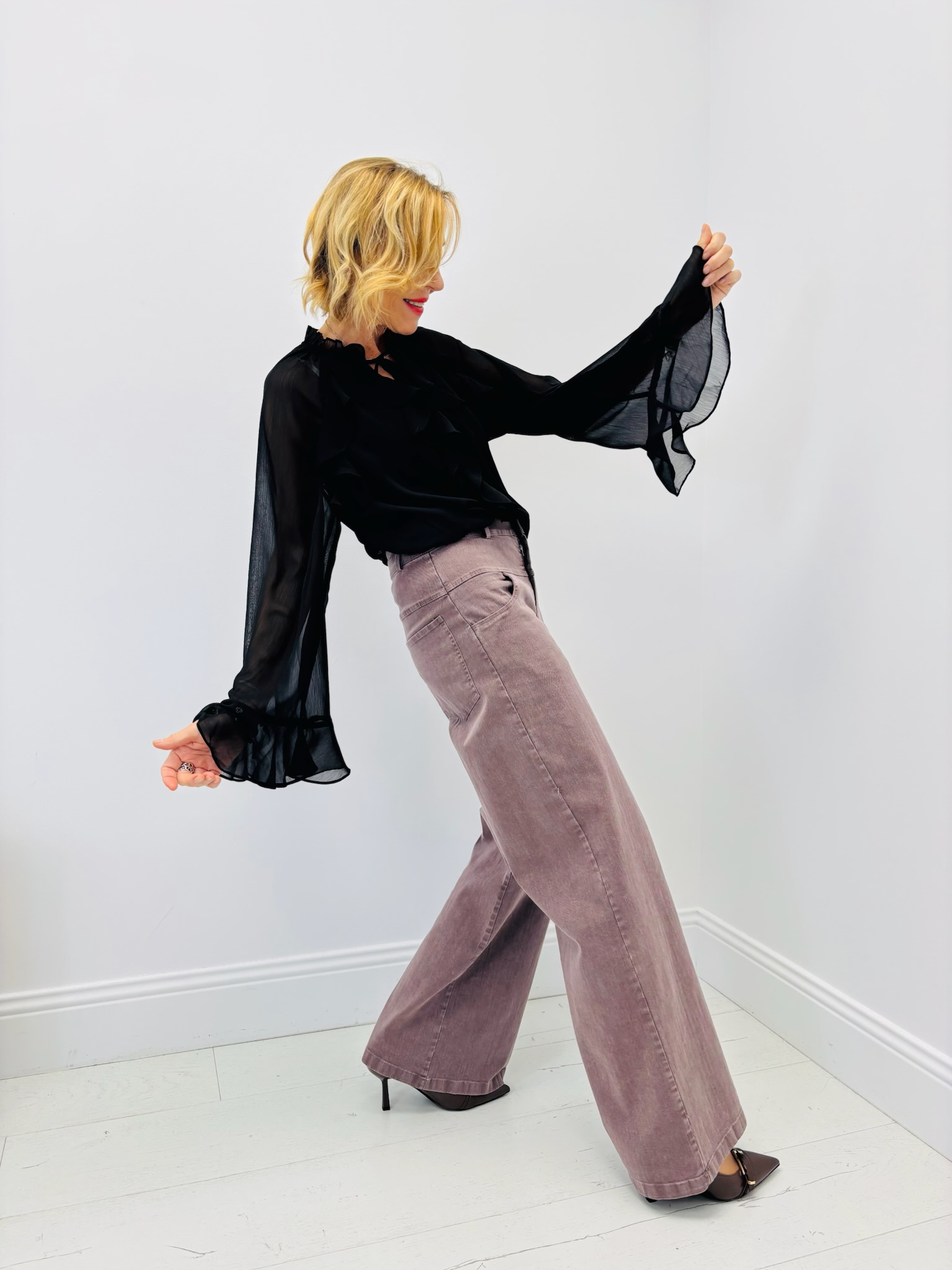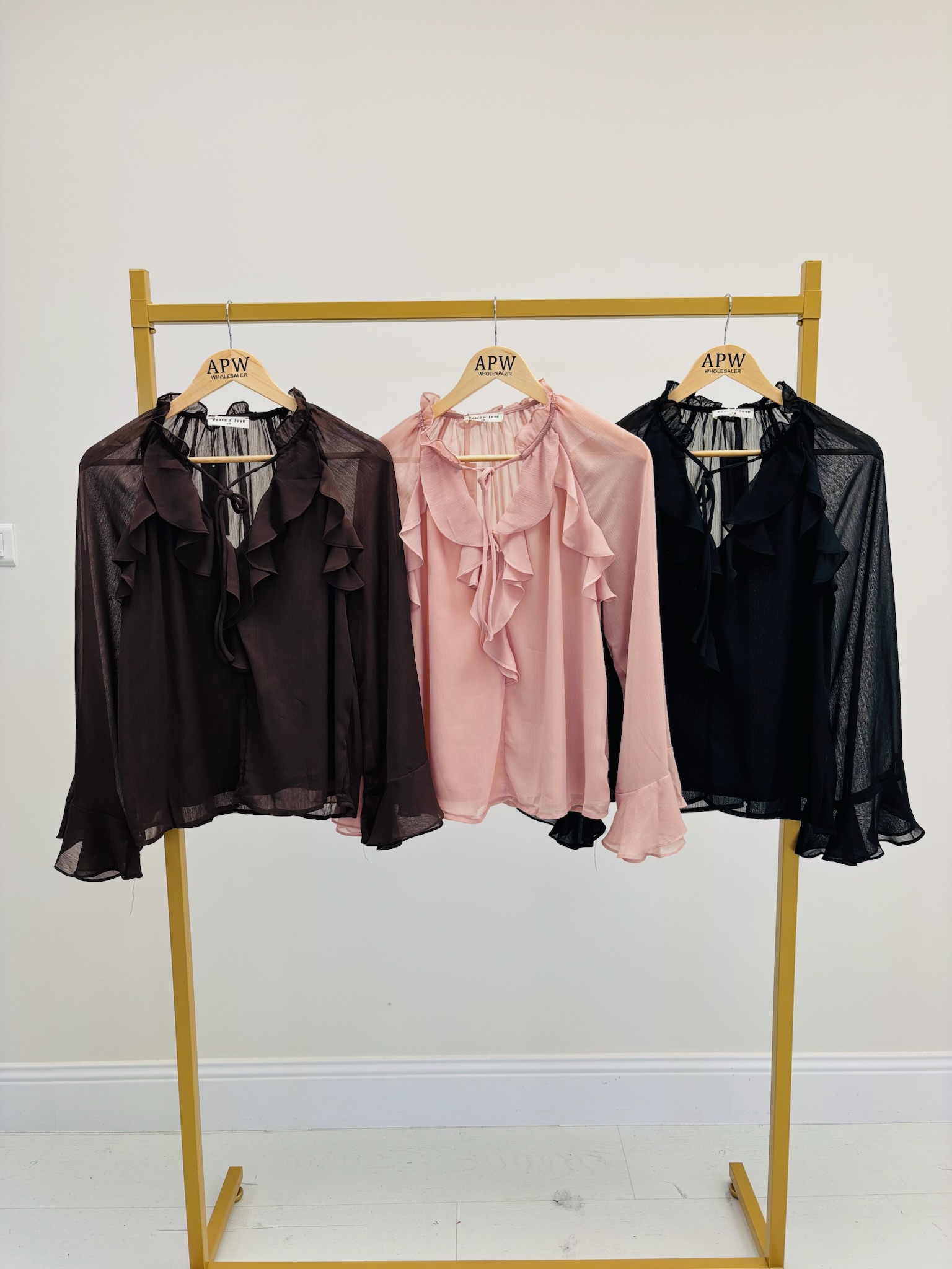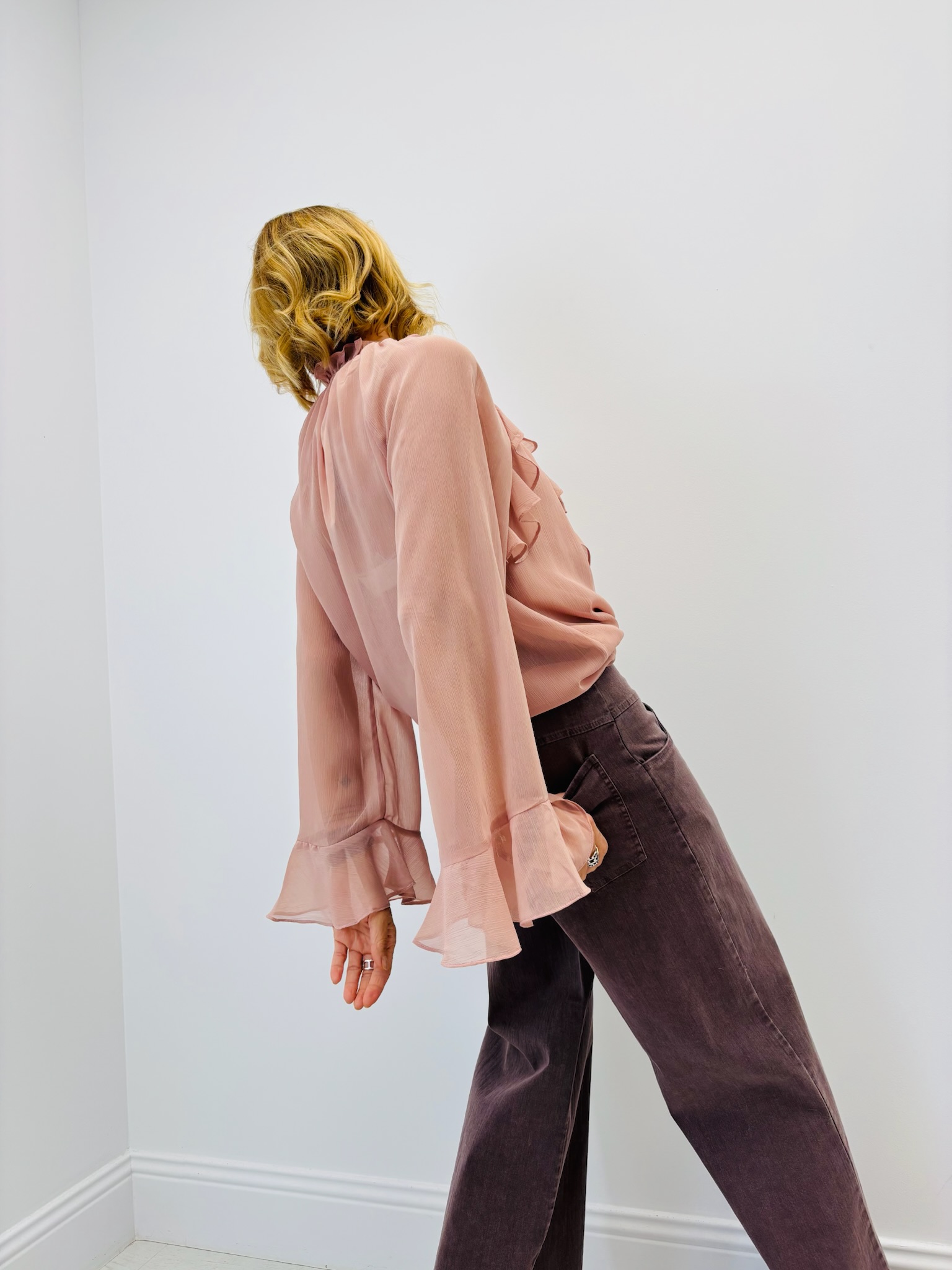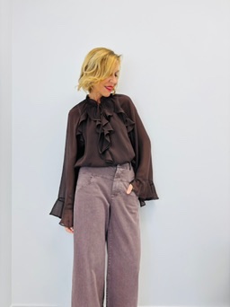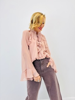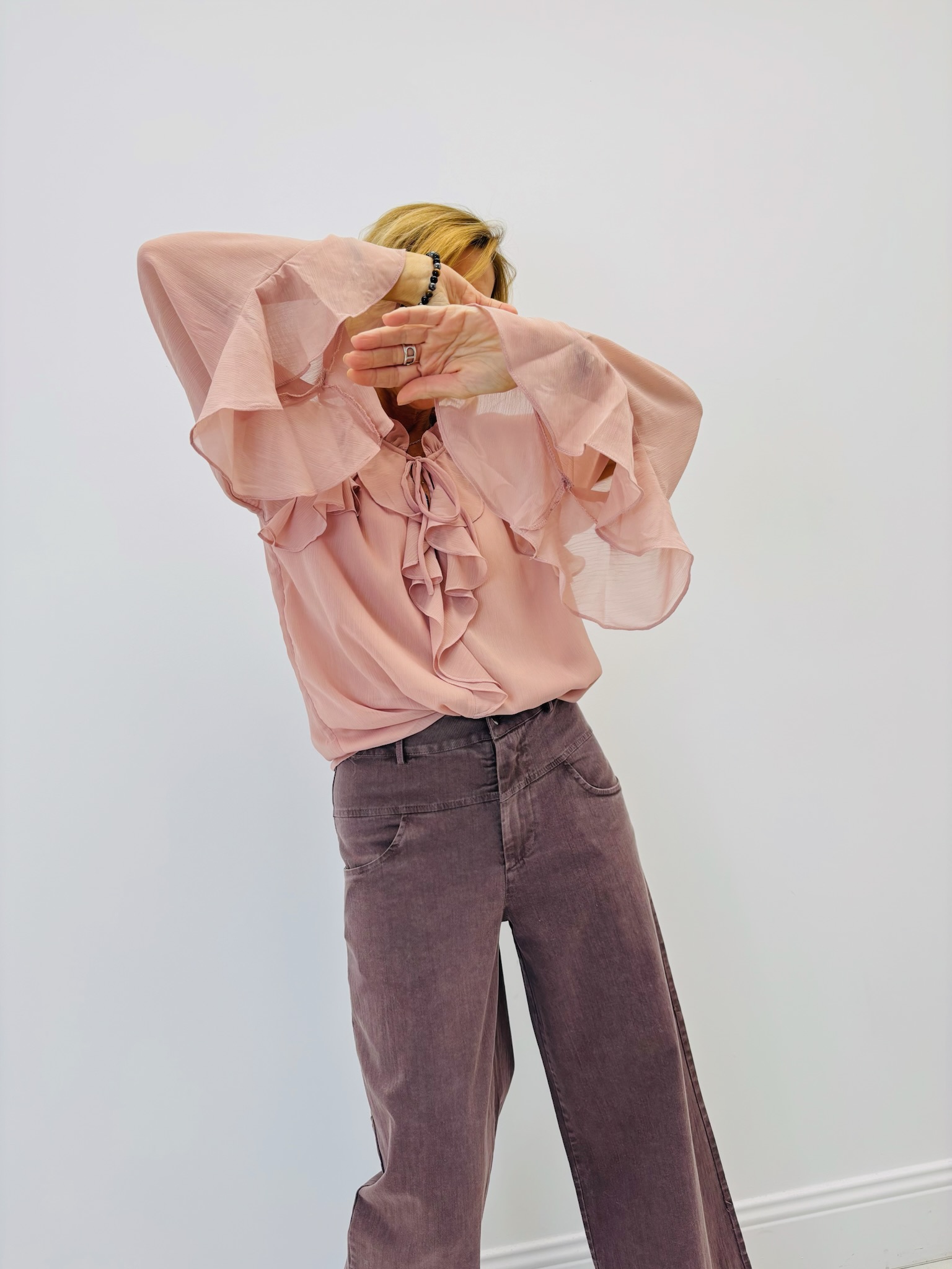 Cette blouse à volants séduit par sa coupe fluide et ses détails délicats : col froncé, lien à nouer et volants romantiques le long du décolleté et des manches.