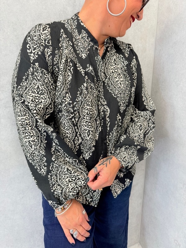 Chic et élégante, cette blouse fluide à imprimé cachemire revisite un grand classique avec modernité. Son motif contrasté noir et écru apporte du caractère à vos tenues tout en restant facile à associer.