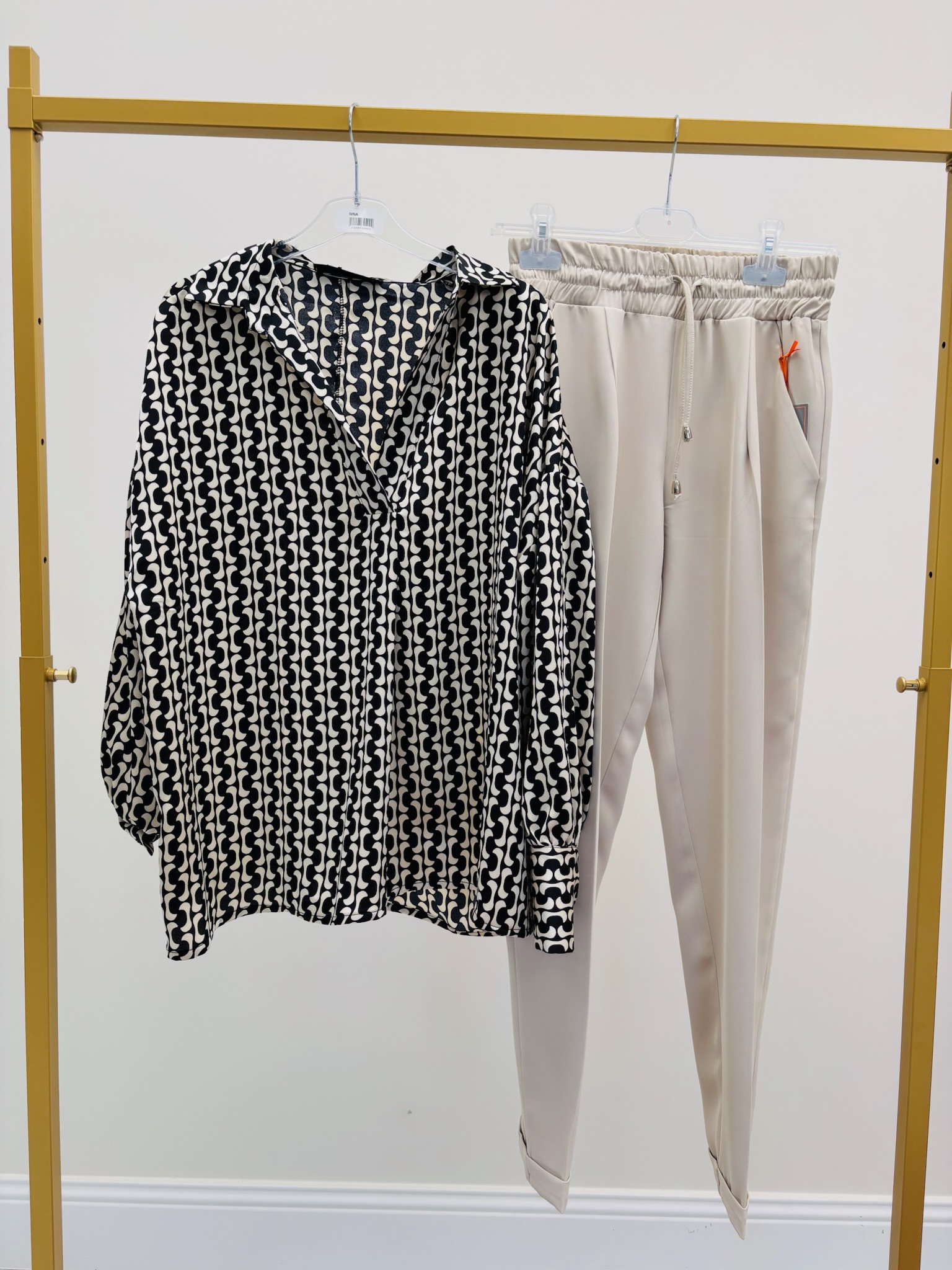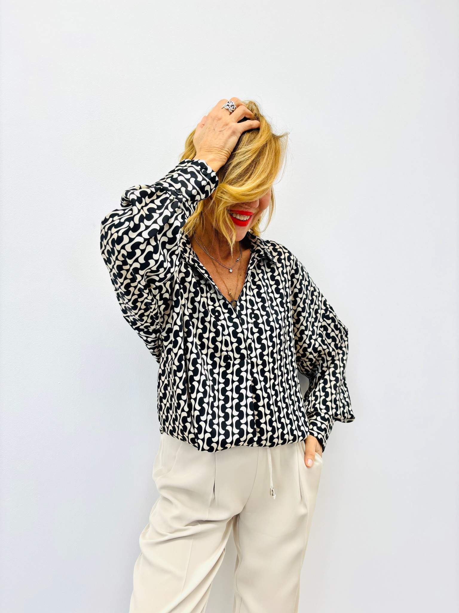 Cette blouse imprimée séduit par son motif graphique noir et écru au style moderne et raffiné.