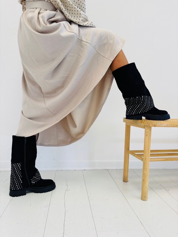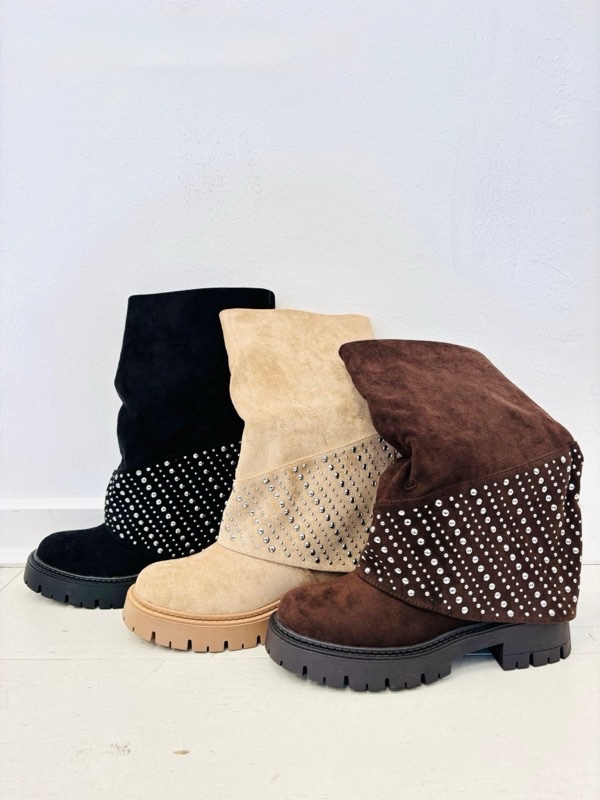 Apportez une touche tendance et affirmée à vos looks avec ces bottes au design unique. Conçues dans une matière douce effet daim, elles se distinguent par leur tige souple et leur empiècement recouvert de petits clous métalliques disposés en motifs ondulés, pour un style moderne et raffiné. La semelle crantée offre confort et stabilité, idéale pour un usage quotidien.