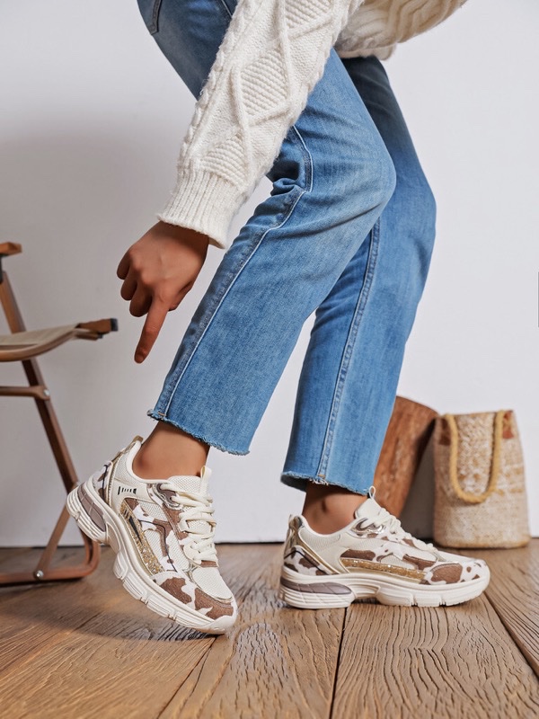 Ces baskets au look affirmé combinent design moderne et confort maximal. Leur semelle épaisse offre une bonne stabilité et une allure tendance, idéale pour donner du style à vos tenues casual. On aime l’imprimé tacheté façon camouflage revisité, contrasté par des empiècements en mesh et détails métallisés pour une touche urbaine chic.