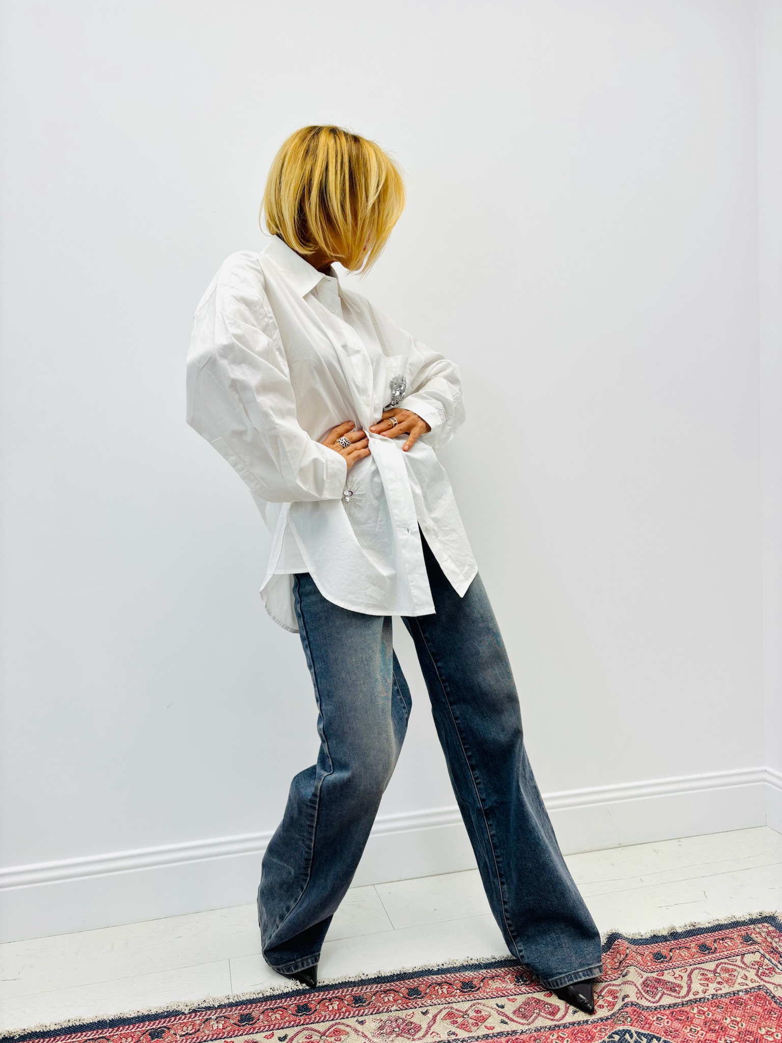 Confectionnée en coton pur, elle allie confort et élégance grâce à sa coupe oversize et ses détails brodés et perlés qui apportent une touche d’éclat subtile.
