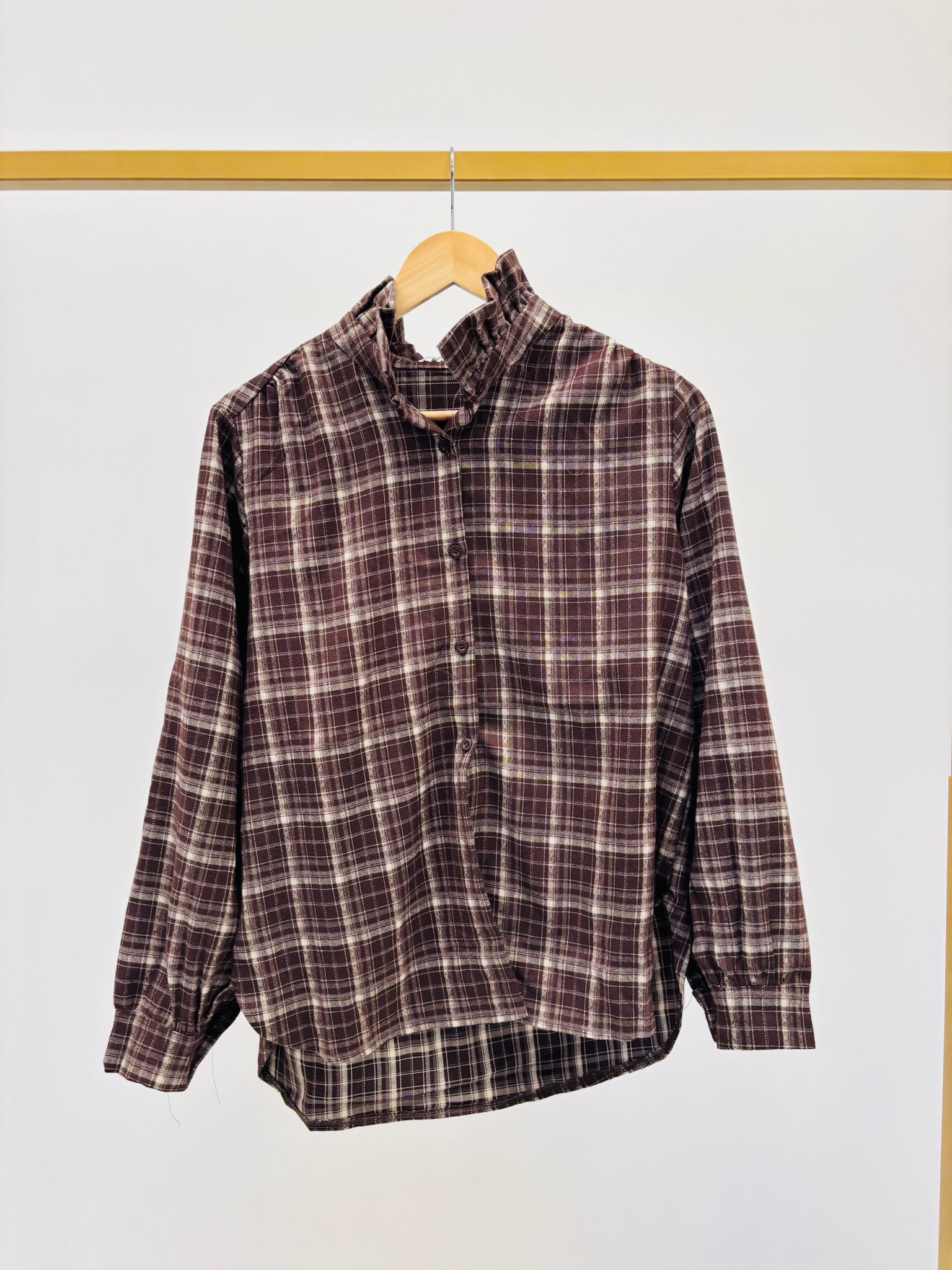 Cette chemise épaisse à carreaux revisite le style victorien avec son col montant délicatement froncé, apportant une touche romantique et élégante à une pièce d’inspiration casual.