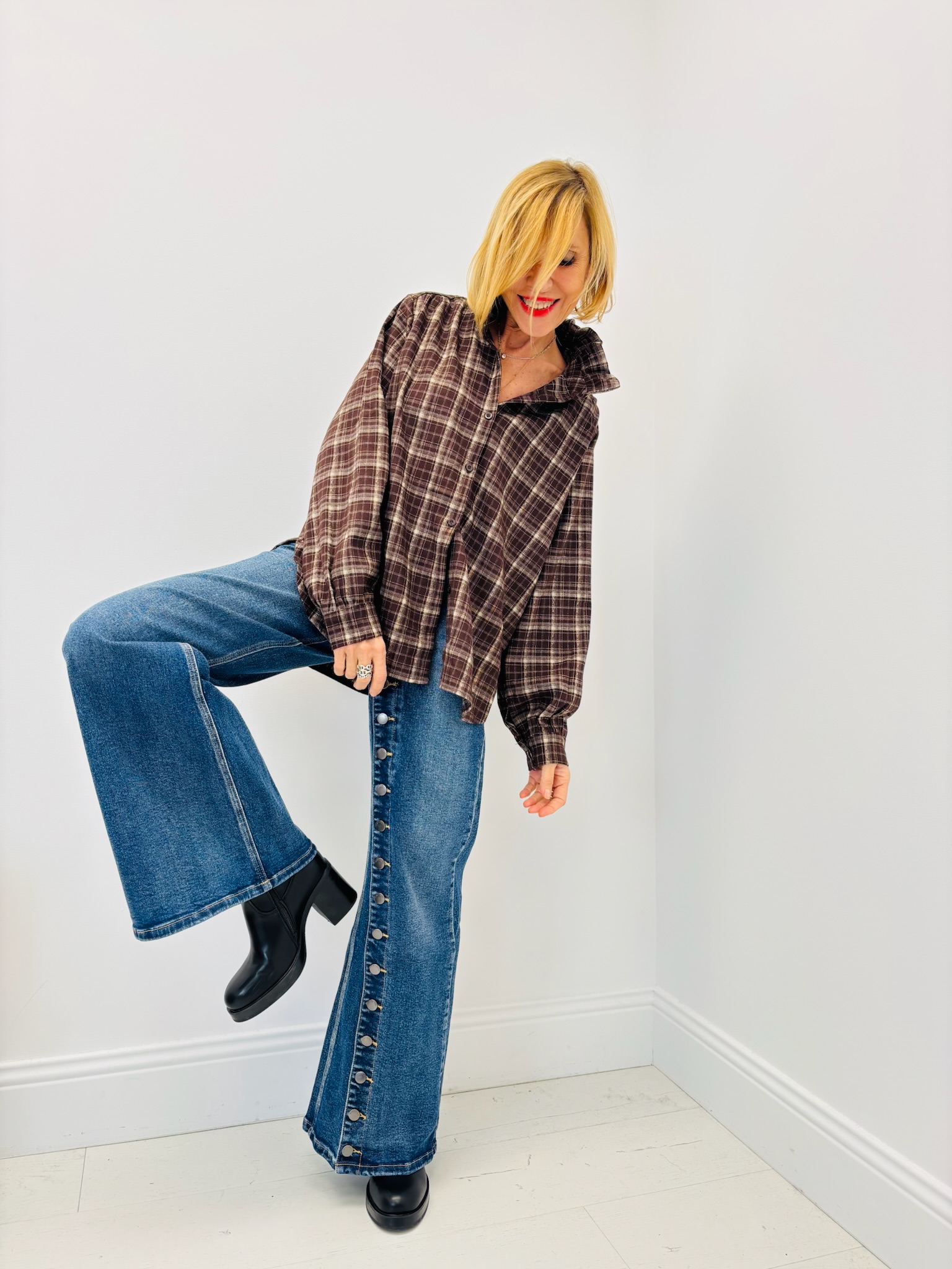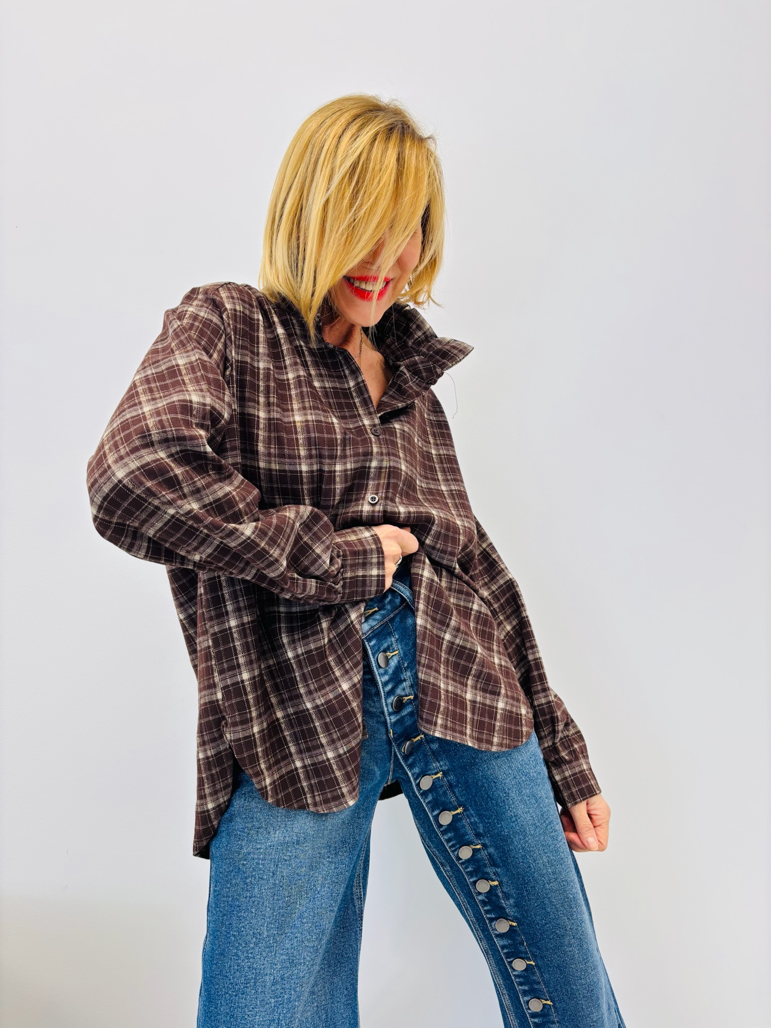 Comme sur la photo, cette chemise peut se porter légèrement ouverte ou rentrée dans un jean wide leg pour un look cosy et moderne.