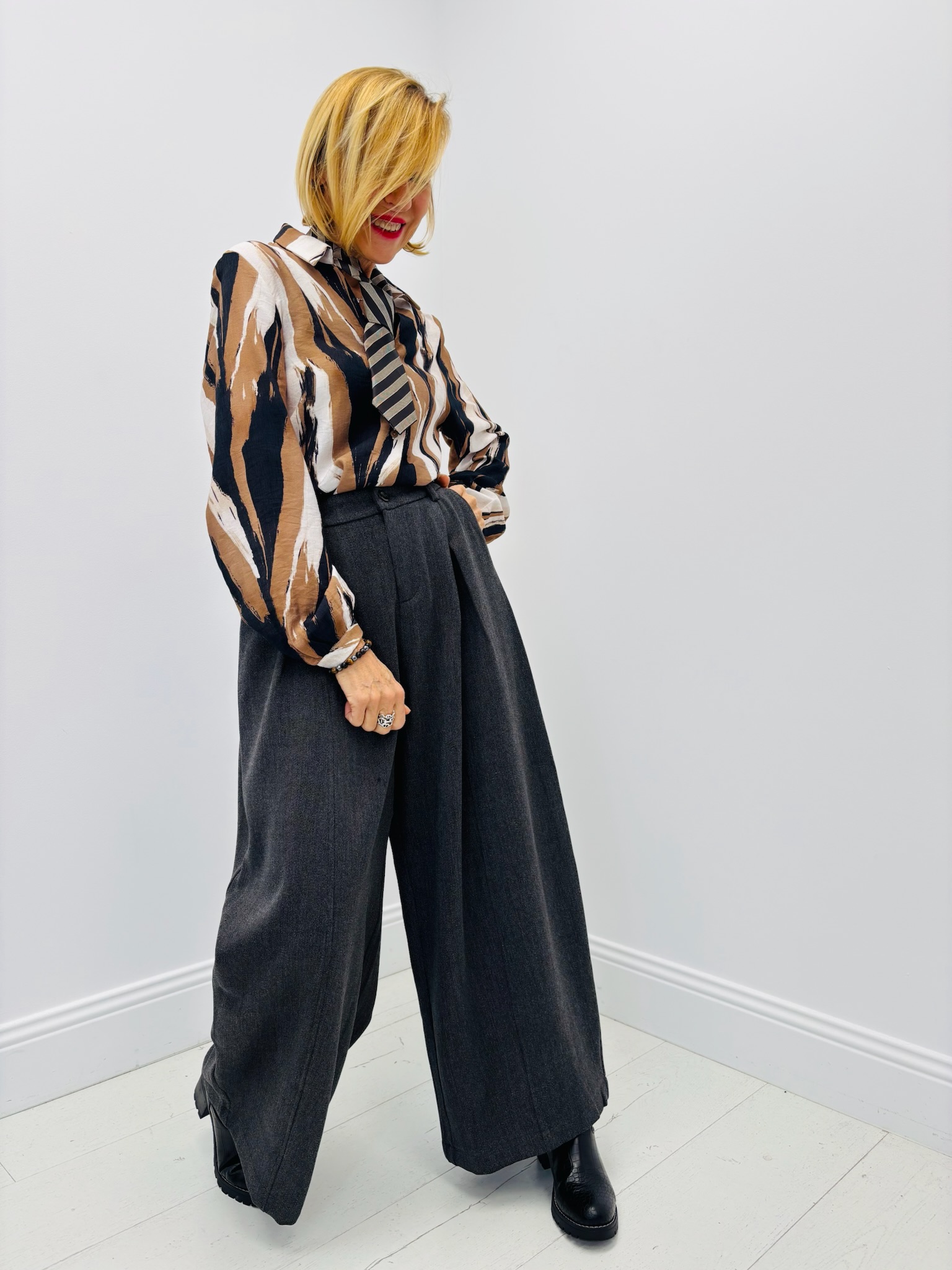 Associez-la à un pantalon large taille haute pour une allure chic et contemporaine, ou à un jean flare pour un style plus casual.