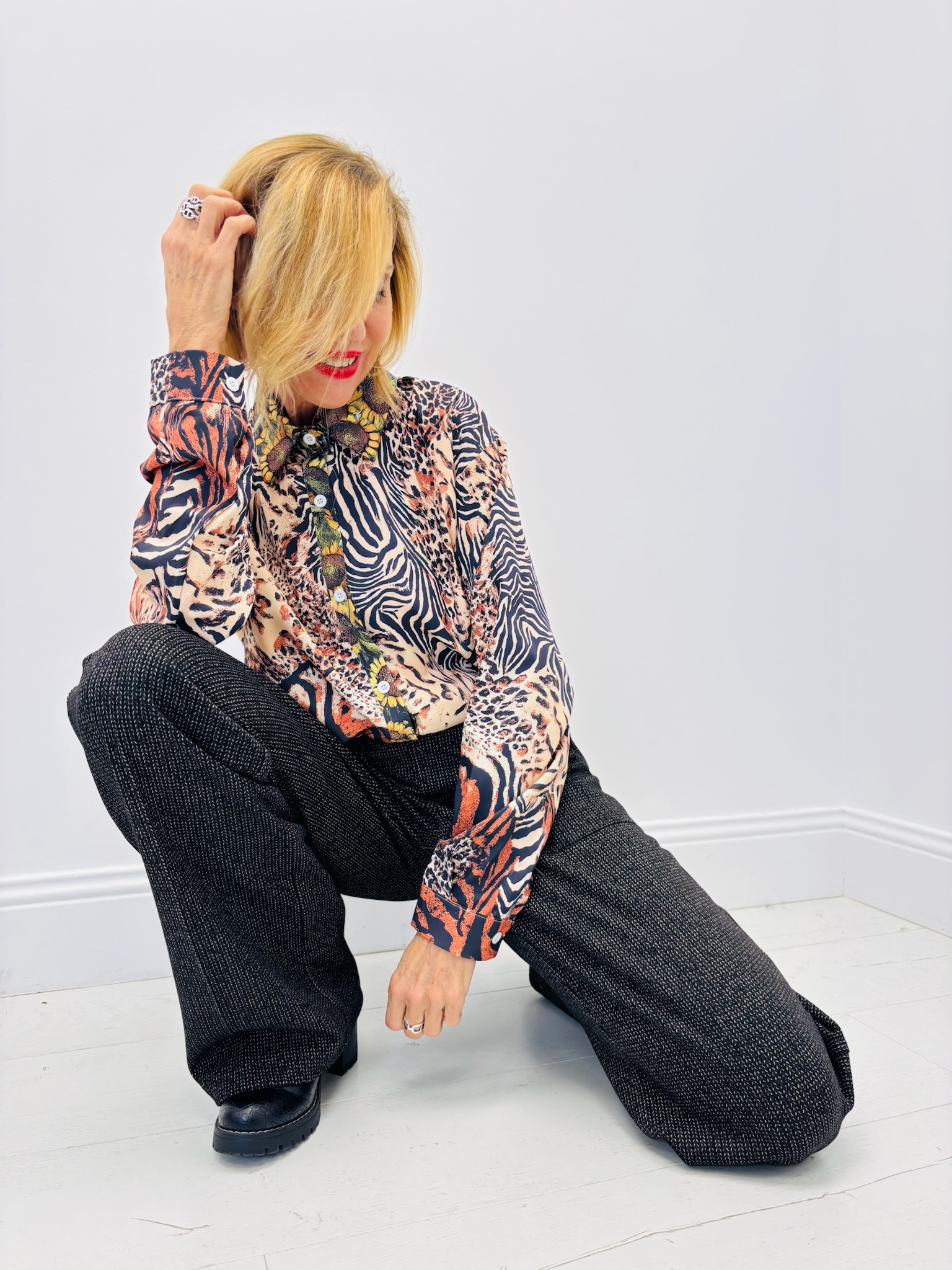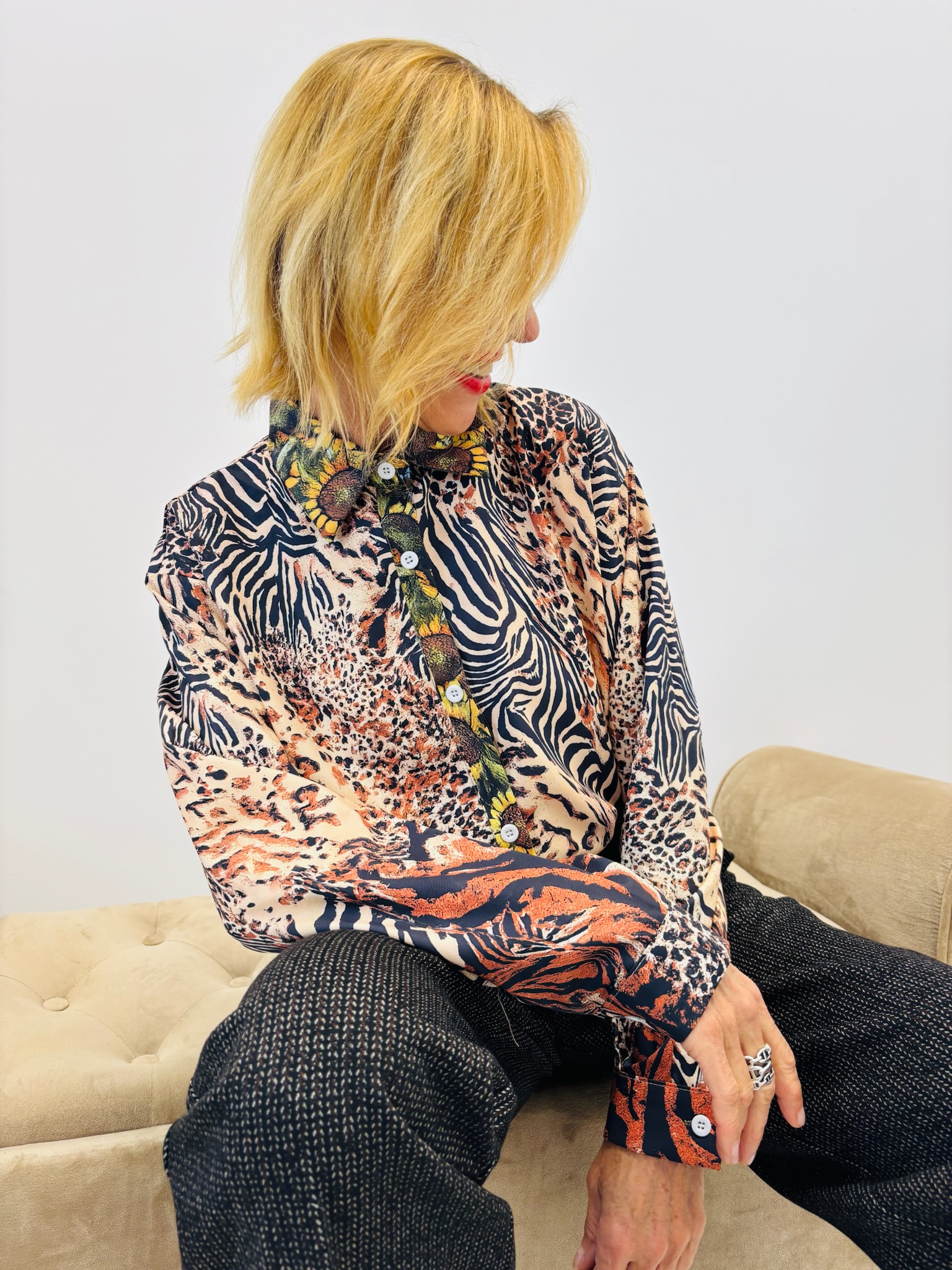 Portée avec un pantalon ajusté ou une jupe midi, elle crée une silhouette féminine et affirmée, entre esprit jungle chic et allure citadine.