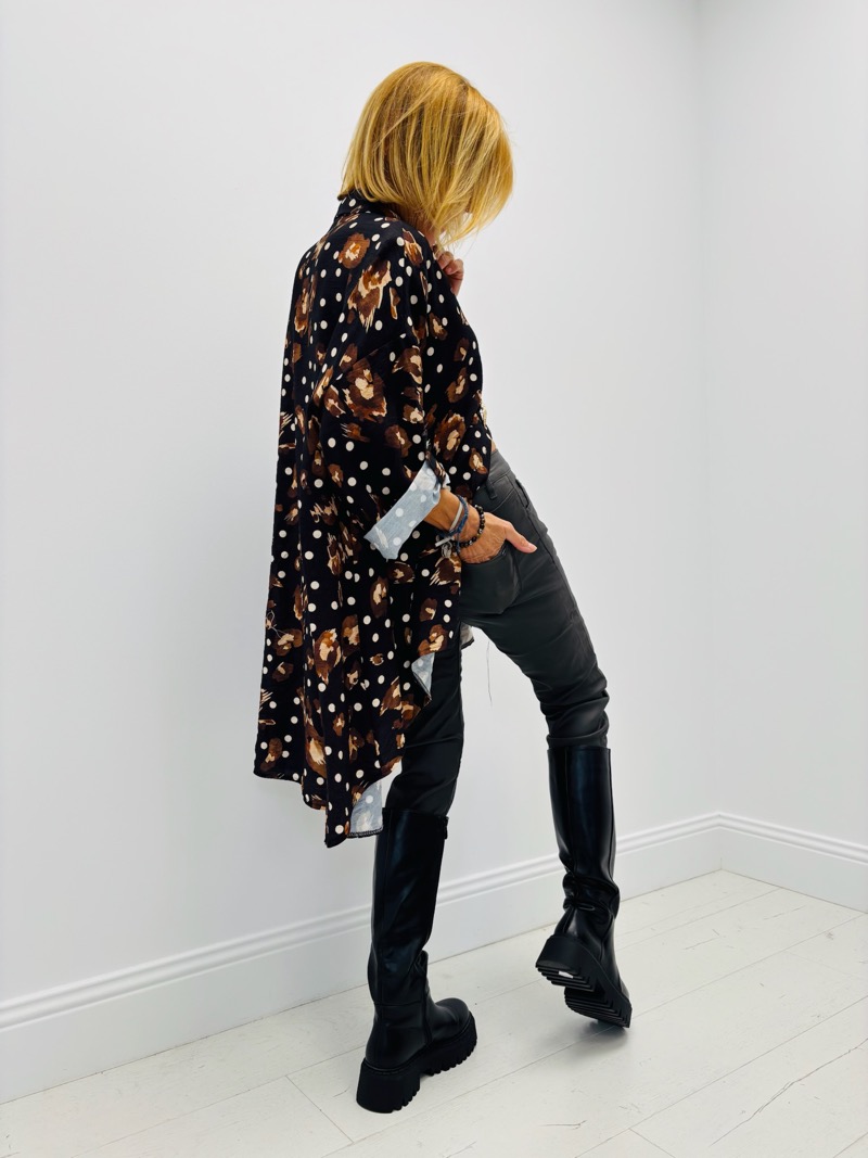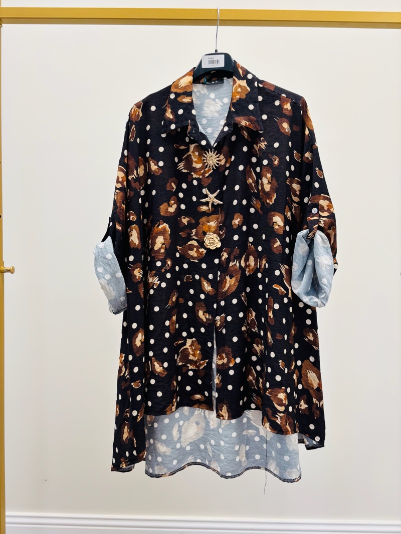 Une chemise fluide et originale qui joue sur les contrastes avec un imprimé pois mêlé à des touches de motifs abstraits. Sa matière légère en viscose assure confort et élégance.
