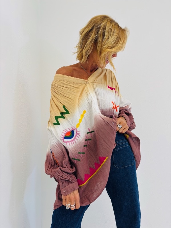 Apportez une touche artistique et originale à vos looks avec cette chemise oversize 100% coton. Sa coupe ample et fluide assure un confort absolu, tandis que son dégradé de teintes s’illumine de broderies aux motifs graphiques et colorés qui lui donnent un esprit bohème et contemporain.
