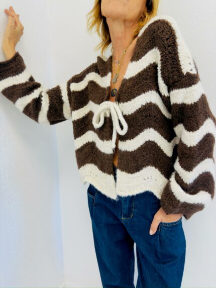 Sa matière fluide et légère permet un tombé impeccable, tandis que les rayures chocolat allongent visuellement la silhouette et apportent une allure moderne et sophistiquée.