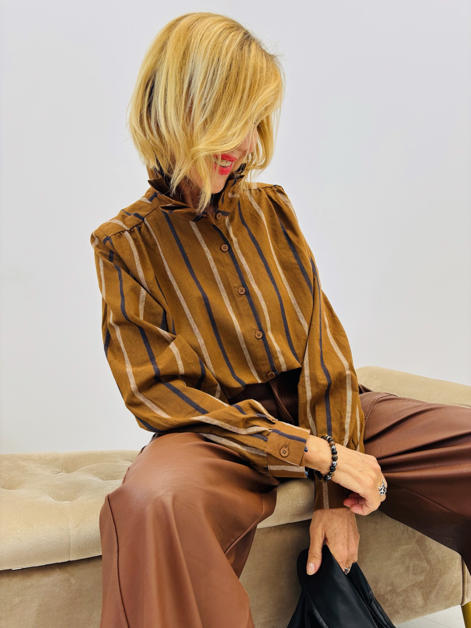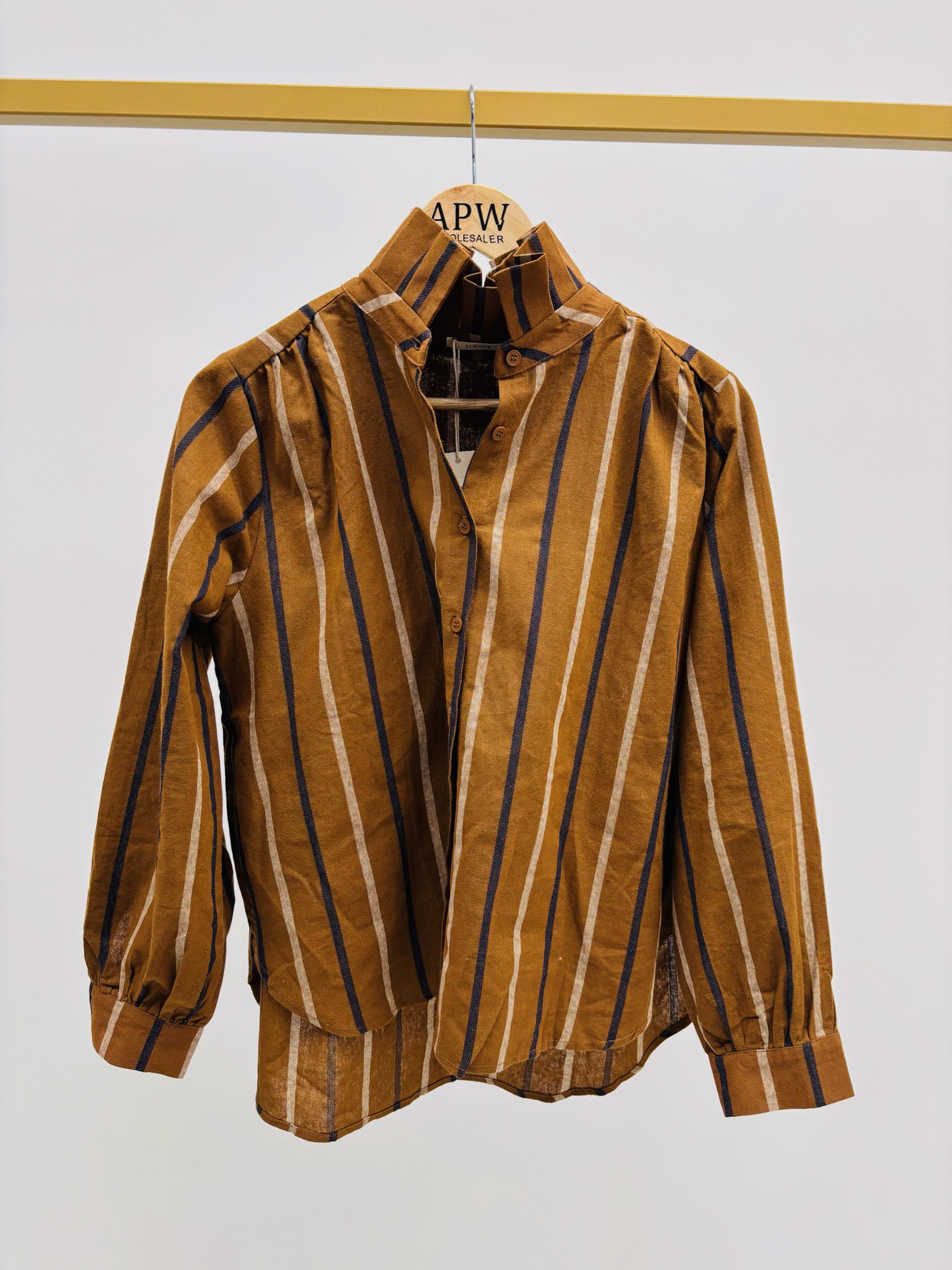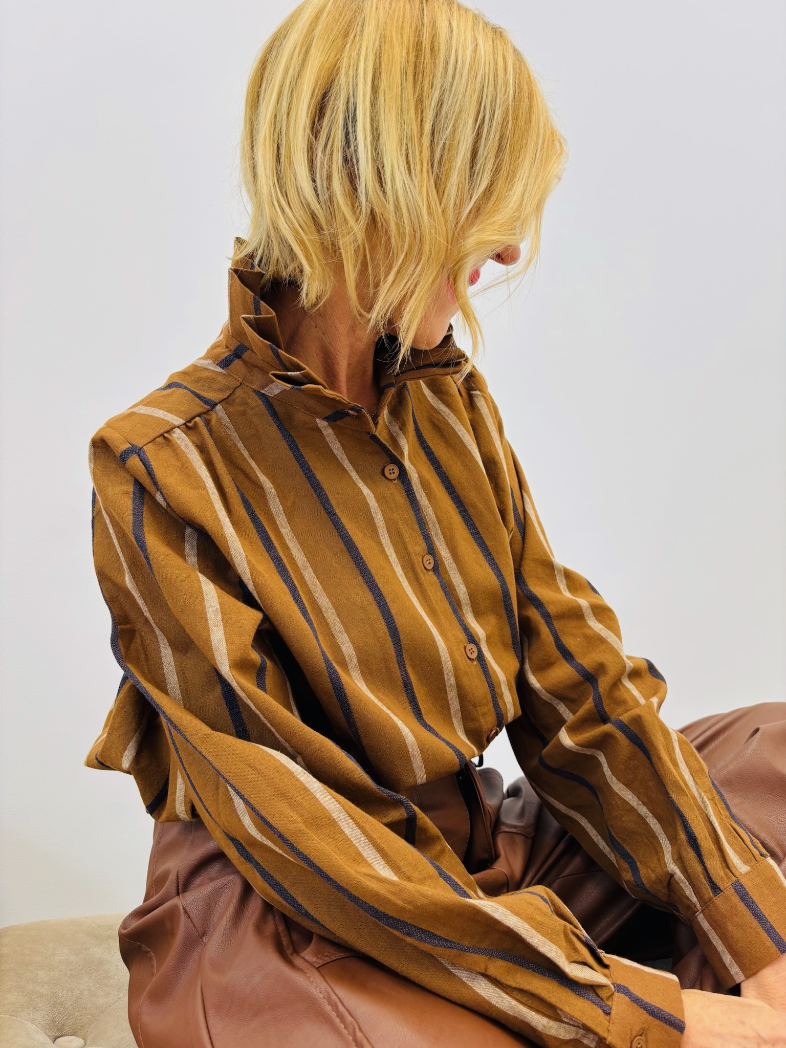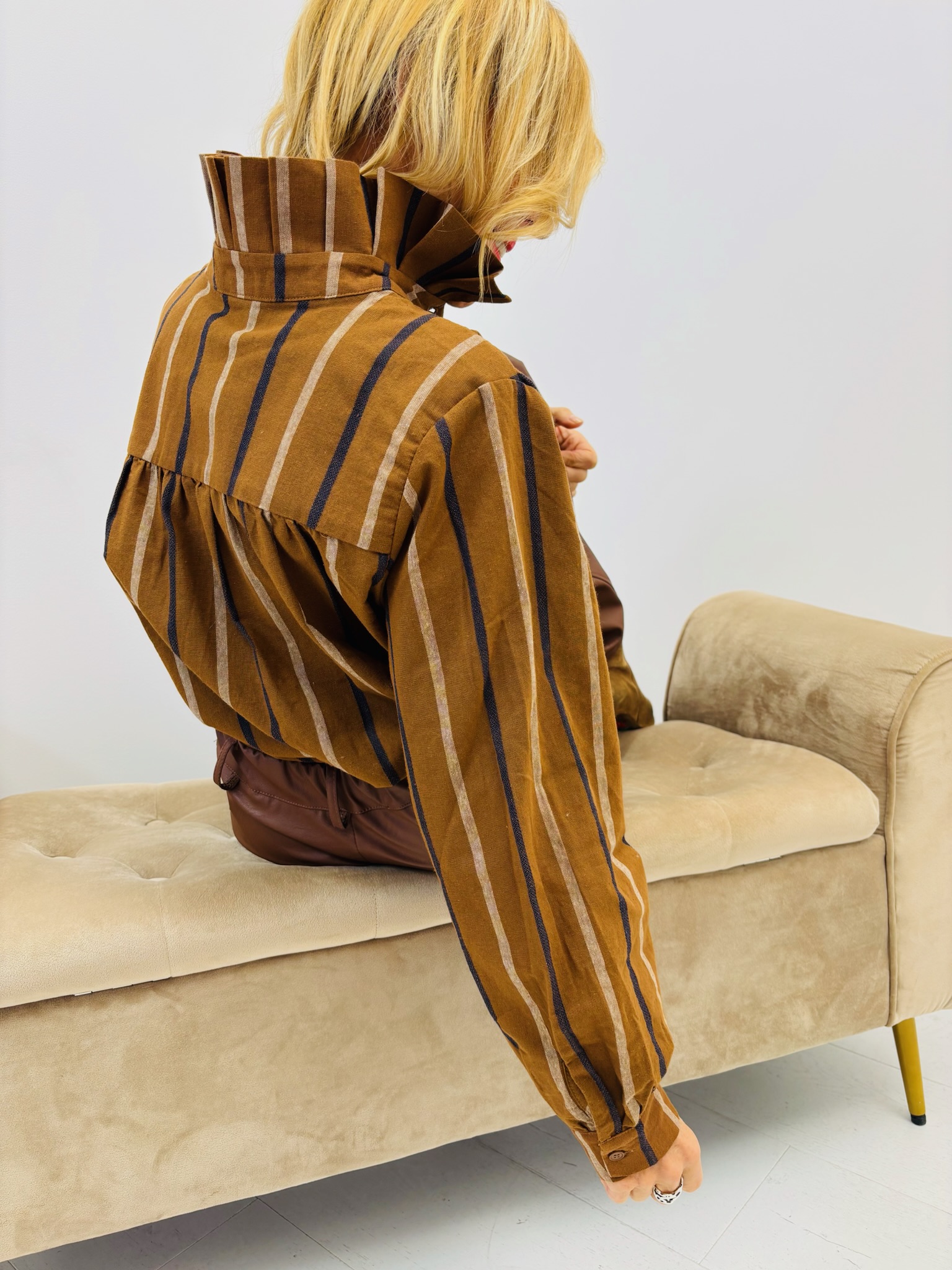 Une chemise élégante au charme rétro et moderne à la fois. Confectionnée en 100 % coton, elle offre un confort naturel et un tombé structuré. Ses rayures verticales élancent la silhouette, tandis que son col montant froncé lui confère une allure sophistiquée et originale.