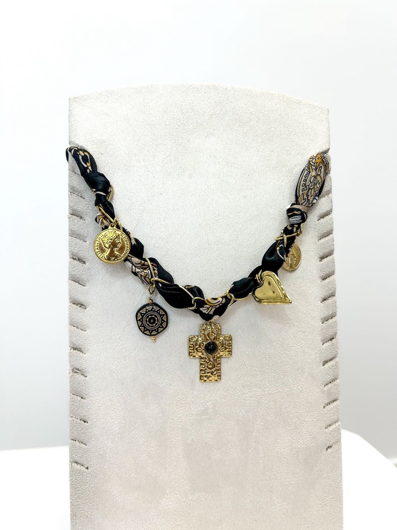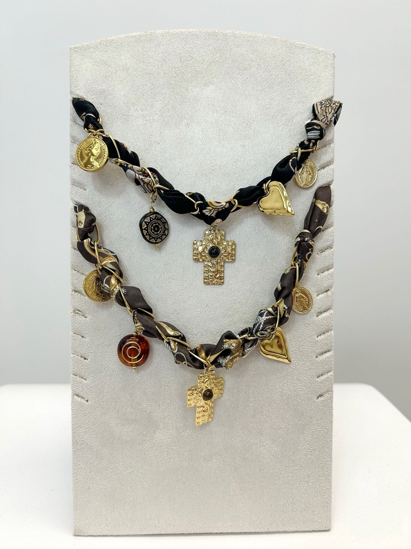 Un collier original et tendance, orné de pendentifs dorés et monté sur un cordon textile torsadé. Une pièce forte qui apporte une touche chic et bohème à vos tenues.