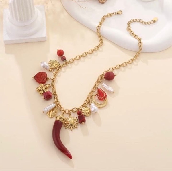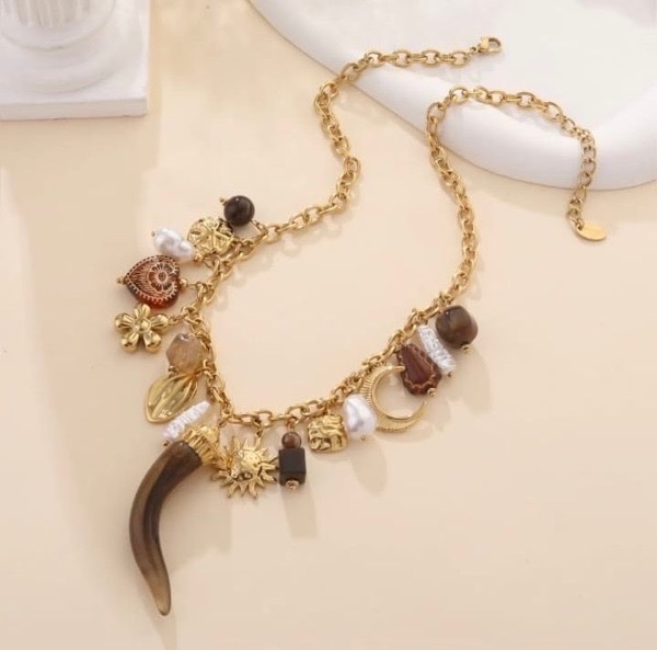 Style : collier orné de multiples pendentifs charms (perles, fleurs, soleils, coquillage, lune, corne).