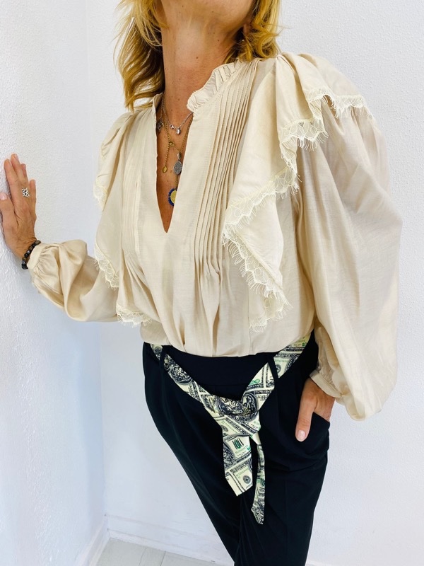 Disponible en plusieurs imprimés (motifs dollars, pois fins ou pois contrastés), elle s’adapte à toutes les envies et permet de personnaliser facilement une tenue sobre.