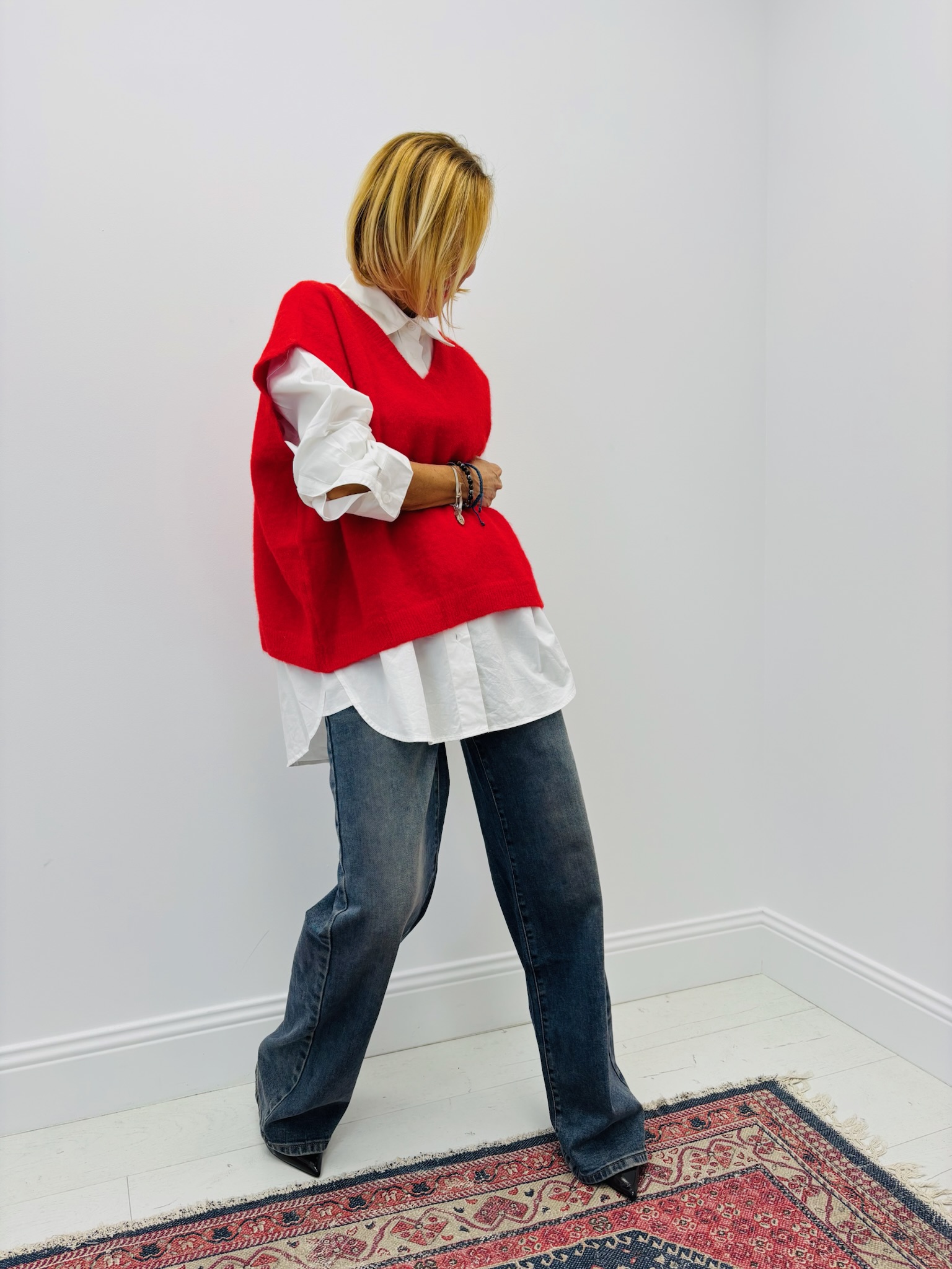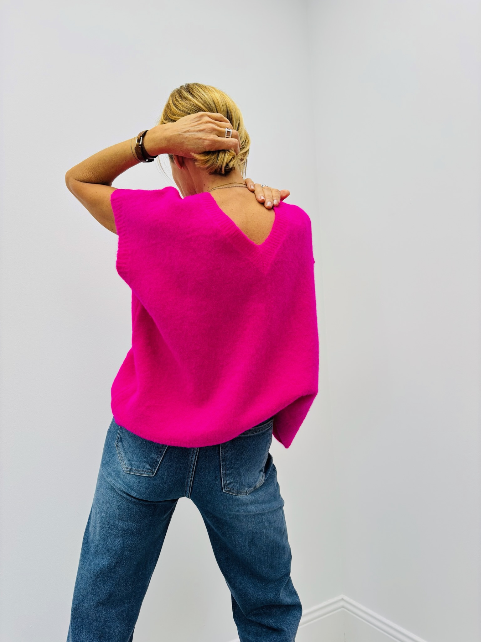 Sa coupe oversize et son col en V devant et dos en font une pièce versatile et élégante, facile à porter seule ou superposée.