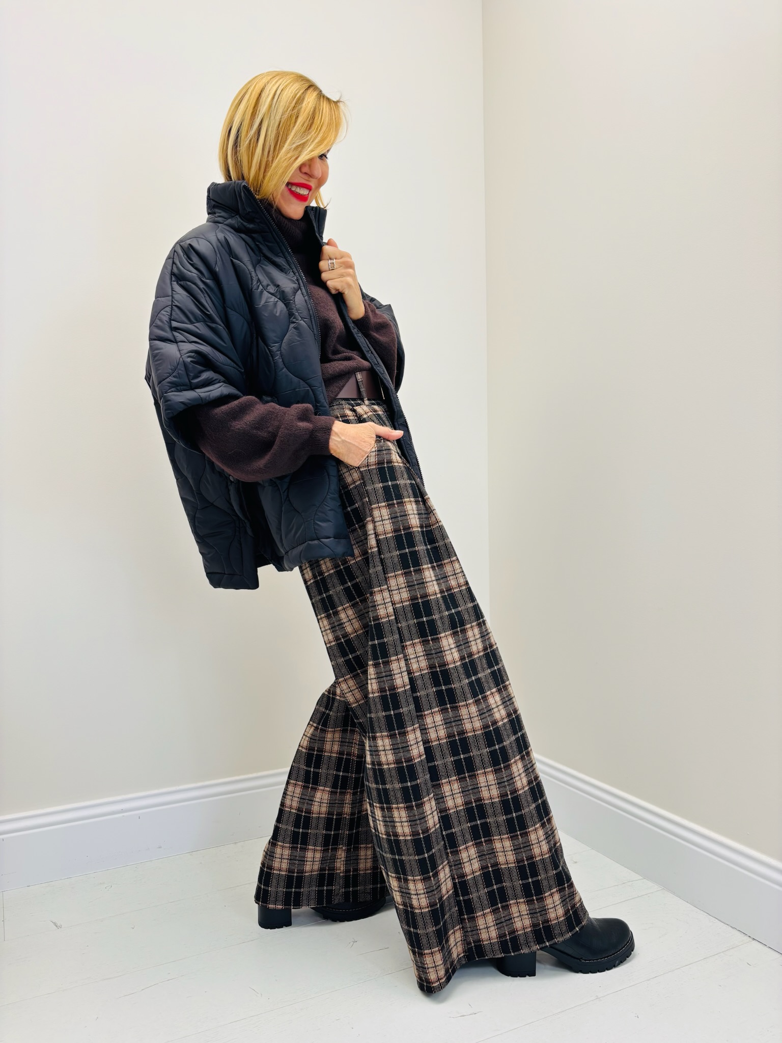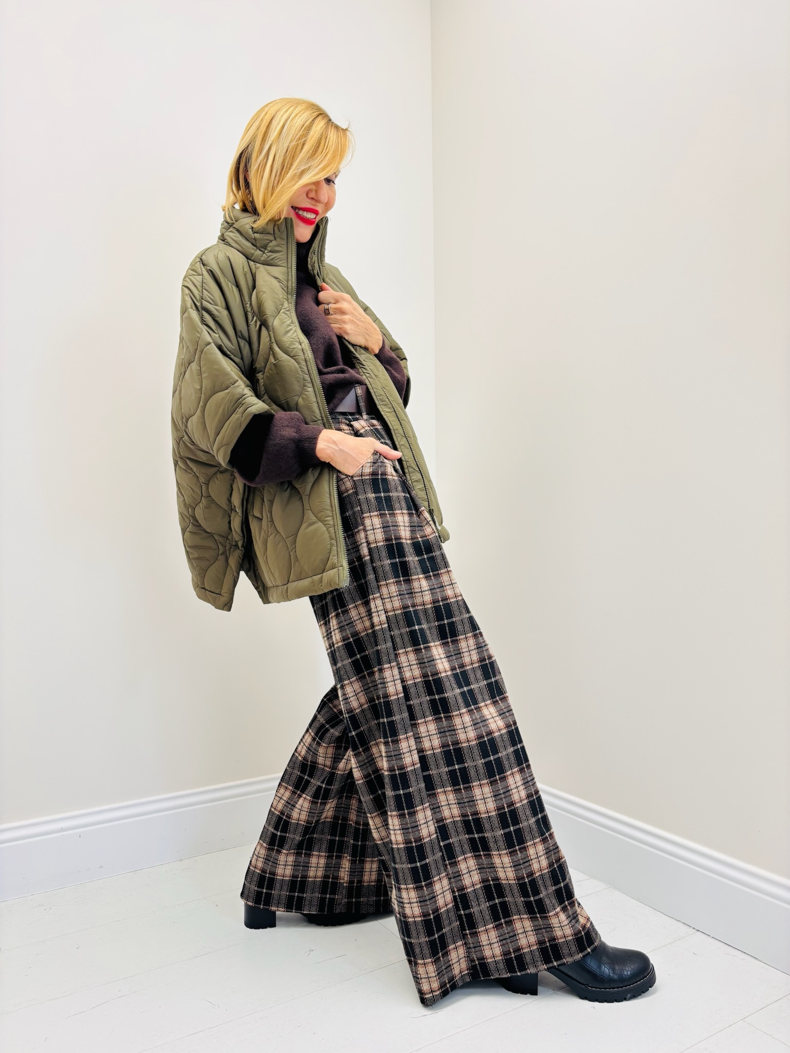 Ajoutez une paire de bottines ou baskets montantes pour finaliser l’ensemble avec une touche casual chic.
