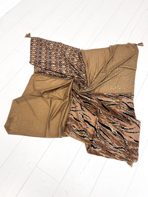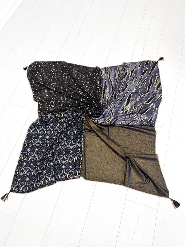 Apportez une touche de style unique à vos tenues avec l’écharpe Chana, un accessoire chic et polyvalent. Conçue dans un patchwork de motifs élégants, elle combine imprimés animaliers, graphiques et détails brillants pour un rendu original et raffiné.