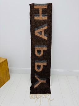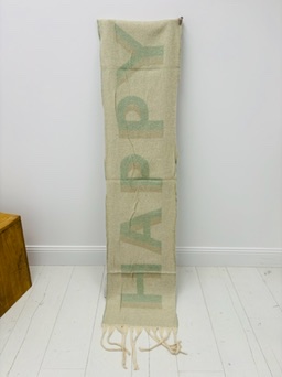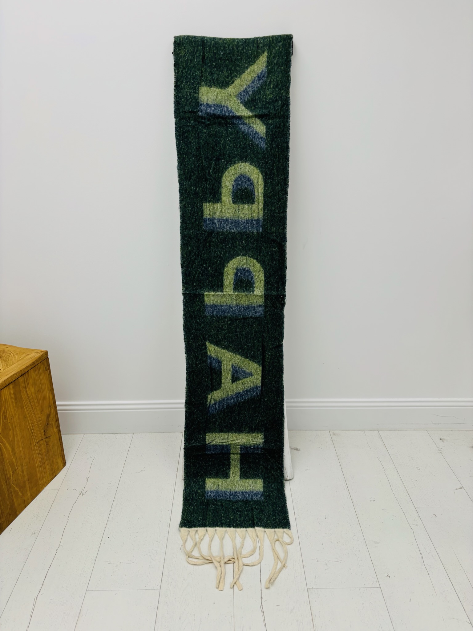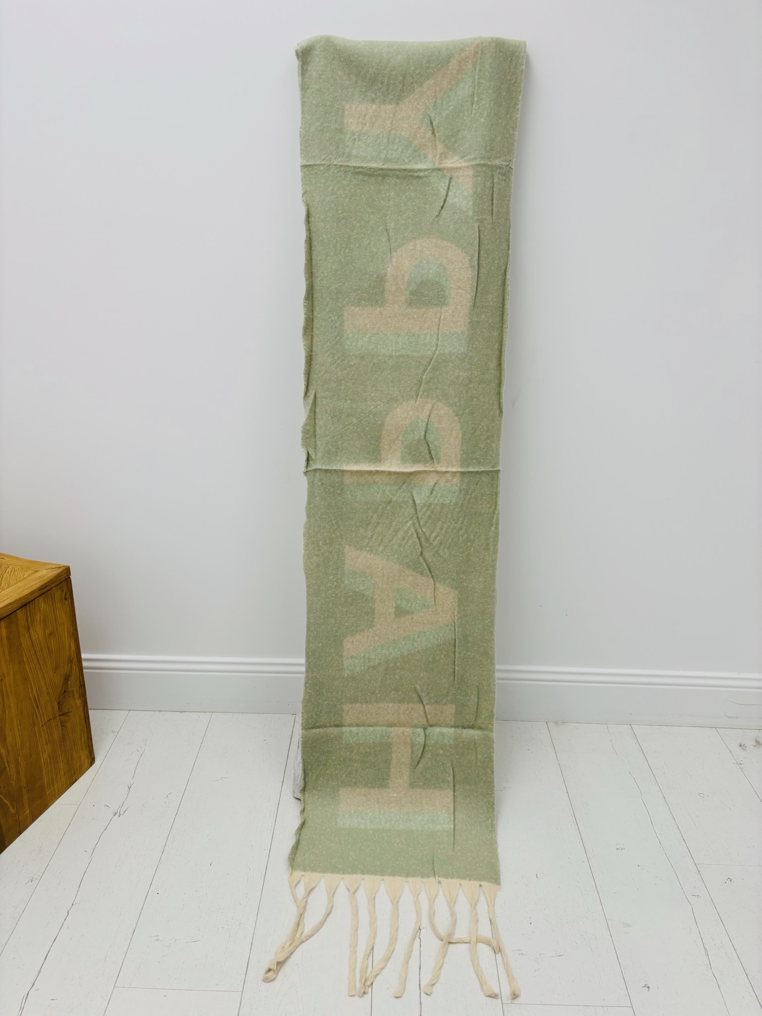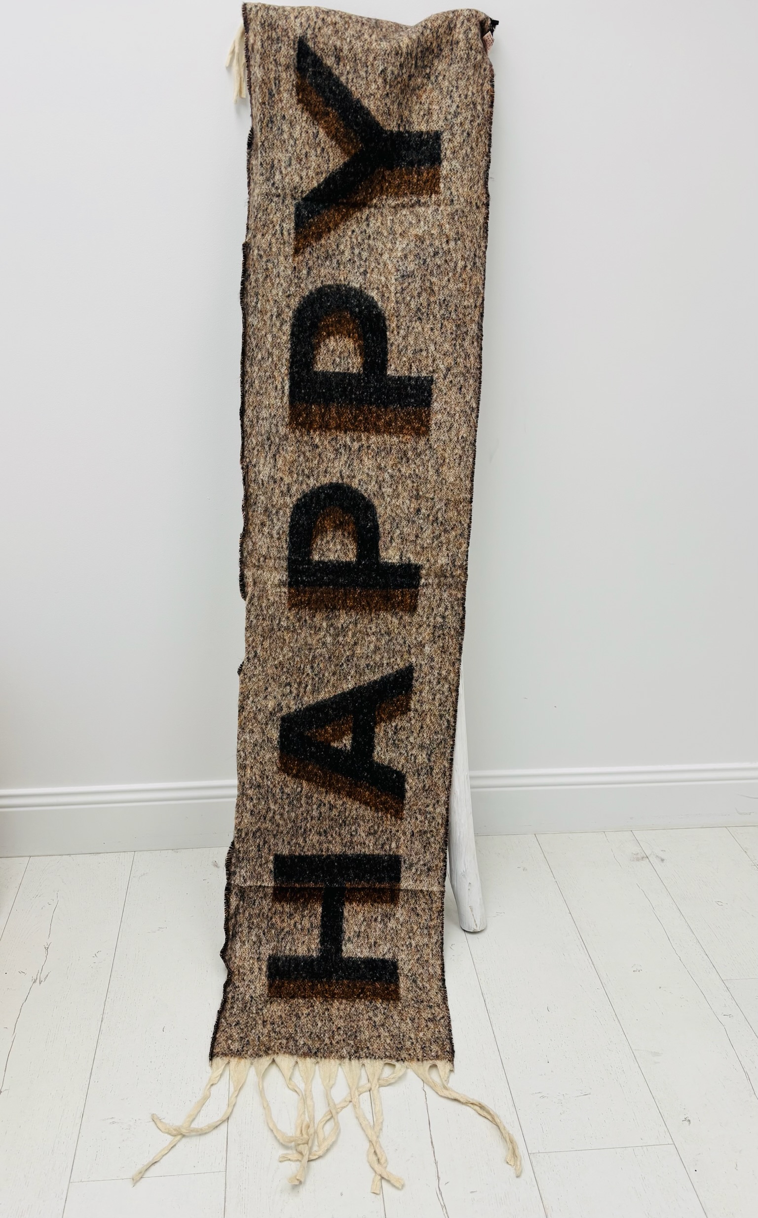 Apportez une touche joyeuse à vos looks d’hiver avec cette écharpe “HAPPY” à message positif et design recto/verso.