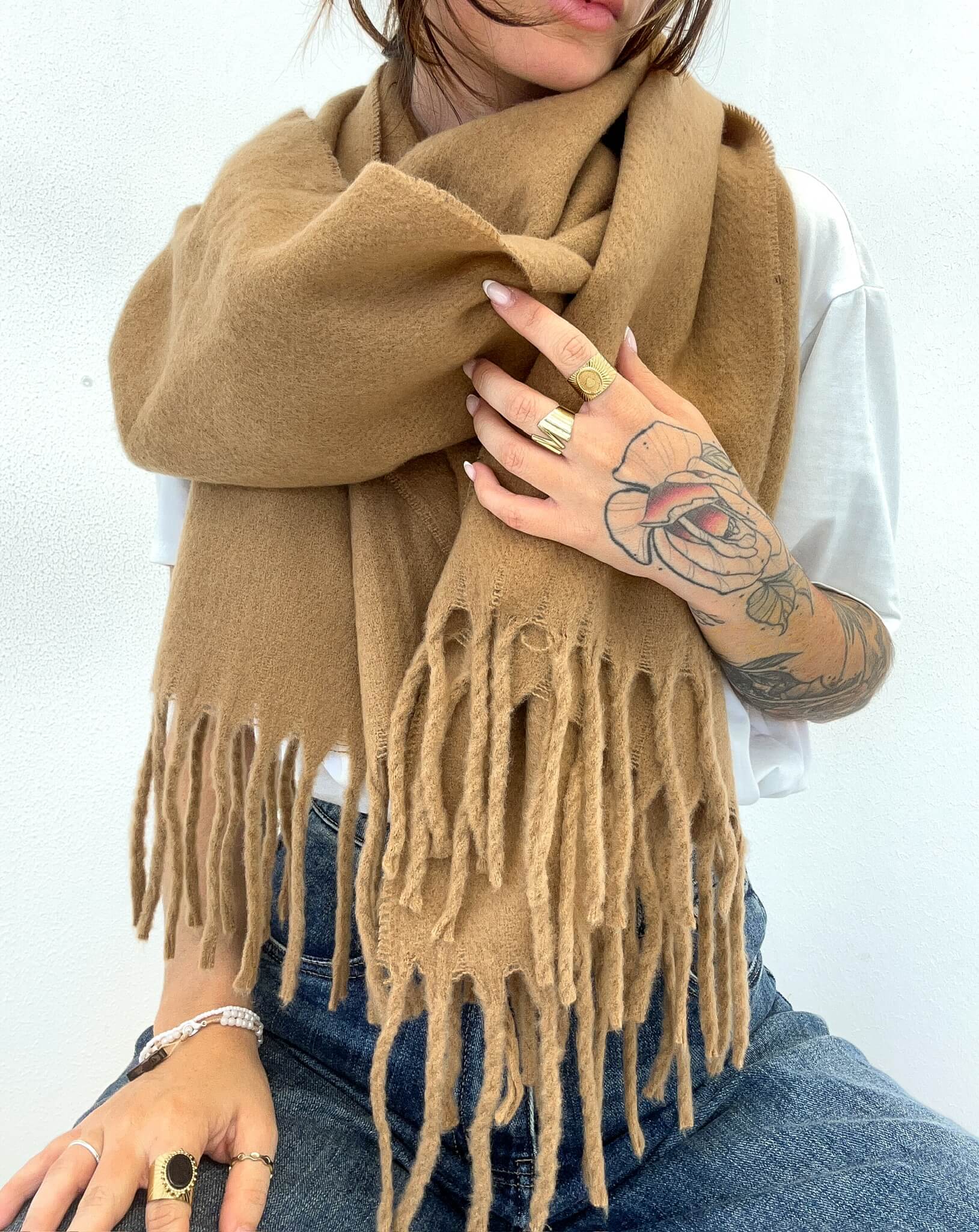 Un indispensable de la saison ! Cette écharpe unie au toucher ultra doux offre chaleur et confort tout en s’adaptant à tous les styles. Grâce à son format généreux, elle se porte aussi bien enroulée autour du cou qu’en châle sur les épaules. Ses franges épaisses lui ajoutent une finition tendance et cosy.