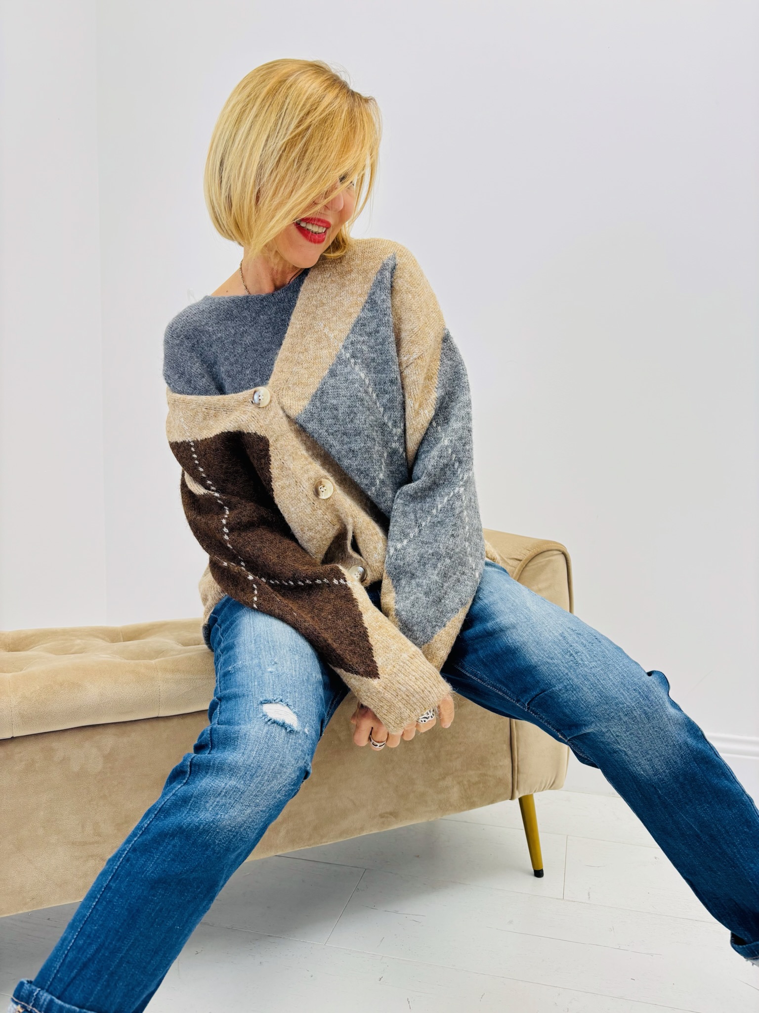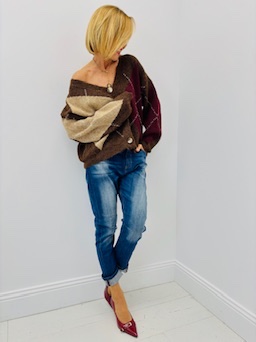 Le motif losanges contrastés et les boutons nacrés en façade lui donnent une allure à la fois élégante et décontractée, parfaite pour la saison.