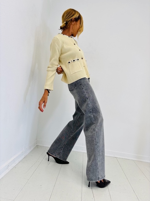Un gilet élégant en viscose côtelée, parfait pour allier confort et raffinement. Son col rond et ses poches sont soulignés de détails perlés et brodés, qui lui donnent un esprit couture très féminin.