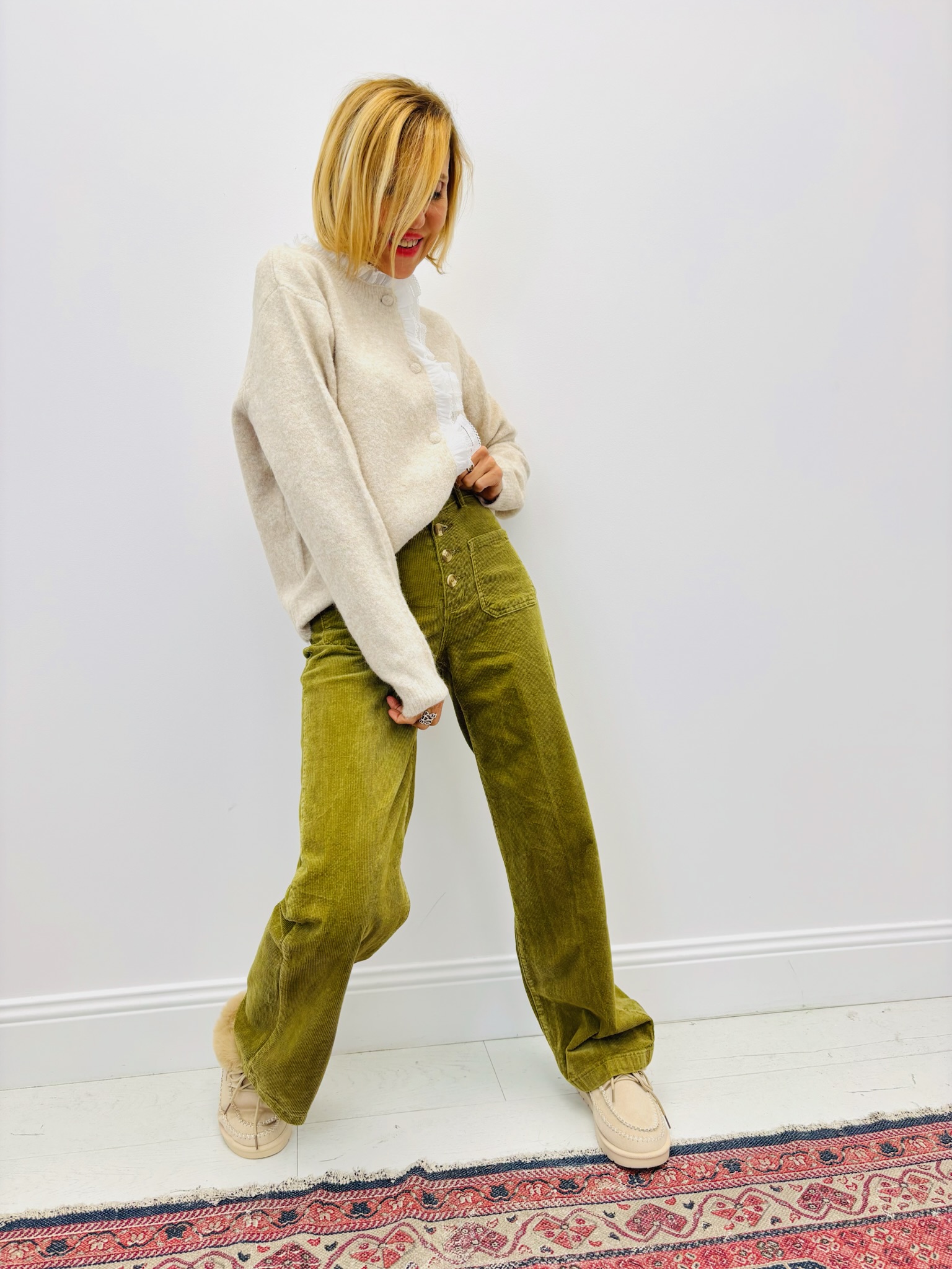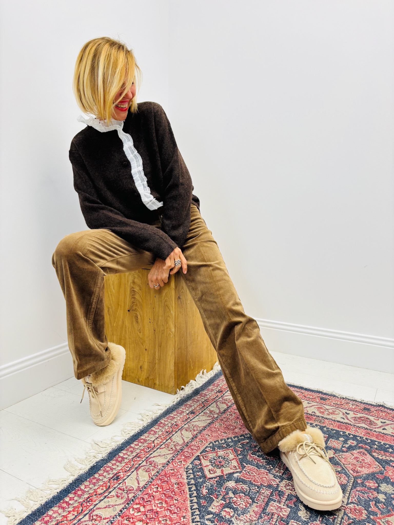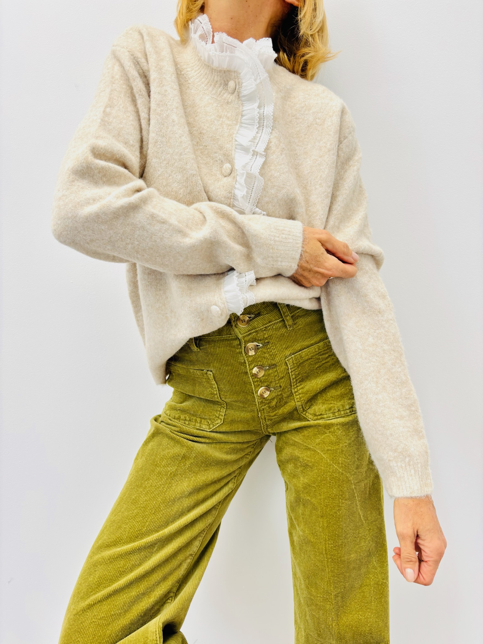 Ce modèle séduit par son col et sa patte de boutonnage ornés de dentelle plissée, qui apportent une touche féminine et délicate à une maille douce et chaude.