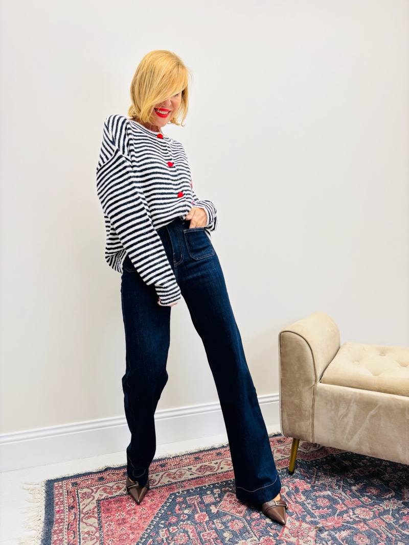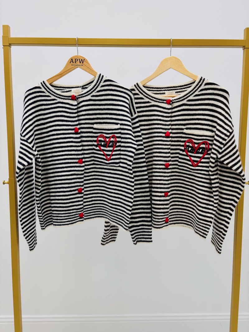 Un gilet plein de charme qui revisite la marinière avec une touche romantique. Ses rayures intemporelles sont rehaussées par des détails rouges vifs : boutons en forme de cœur et broderie poitrine.