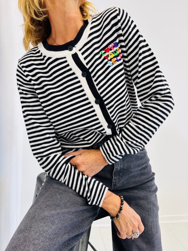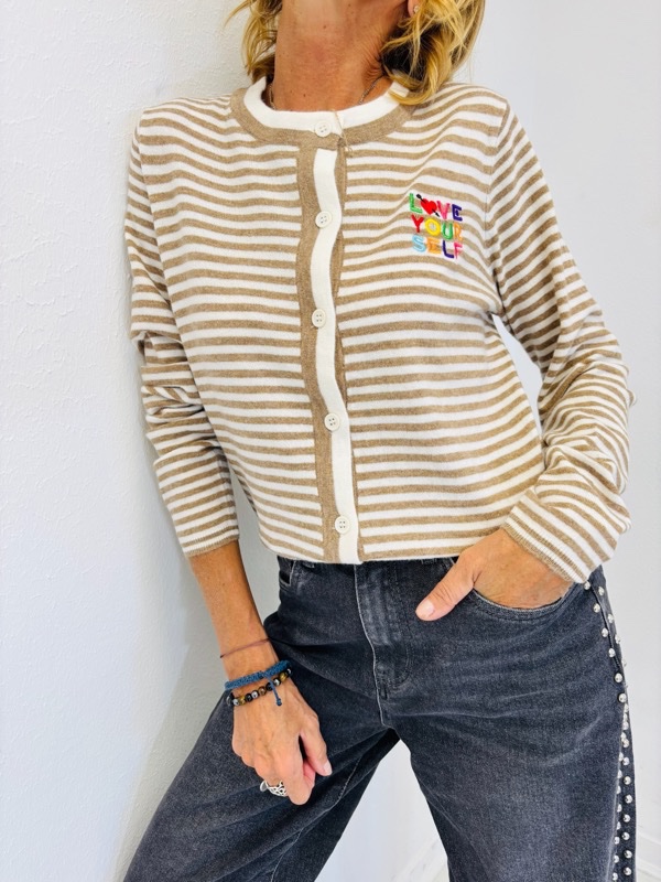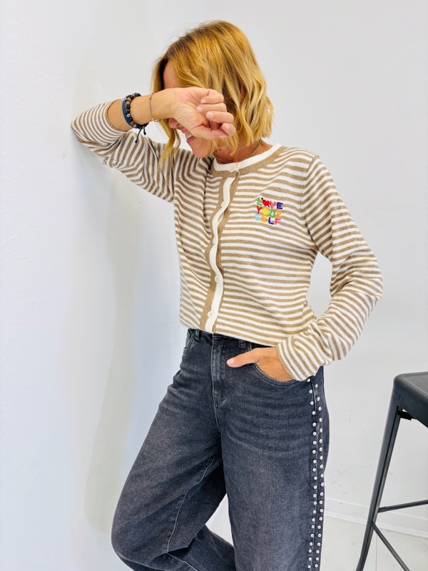 Un gilet rayé moderne qui allie confort et style. Sa maille douce et légère en fait une pièce agréable à porter au quotidien. Il se ferme par une rangée de boutons sur le devant et se distingue par un détail brodé coloré “LOVE YOURSELF” sur la poitrine, qui apporte une touche tendance et originale.