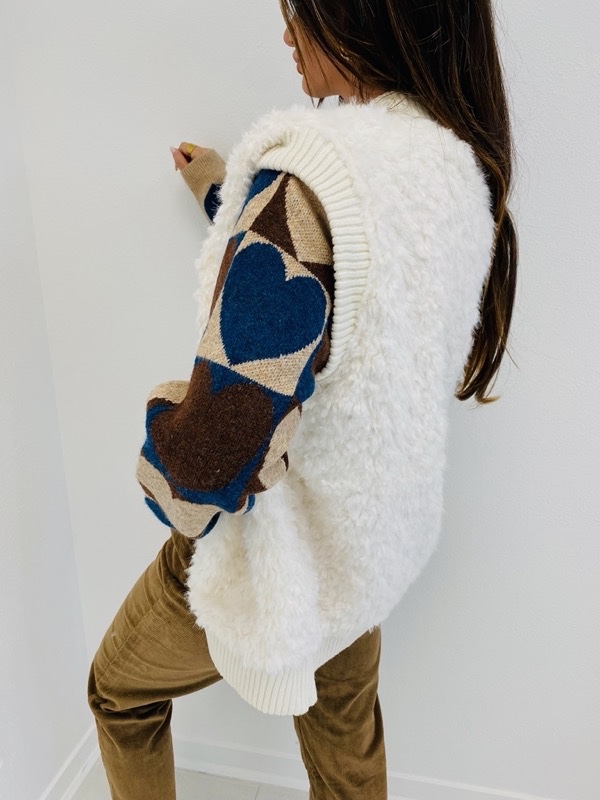 Un gilet sans manches ultra tendance qui allie confort et style. Sa texture effet moumoute apporte douceur et chaleur, idéale pour superposer sur vos pulls ou chemises. Les larges boutons contrastés et la finition côtelée aux bordures ajoutent une touche moderne et raffinée.