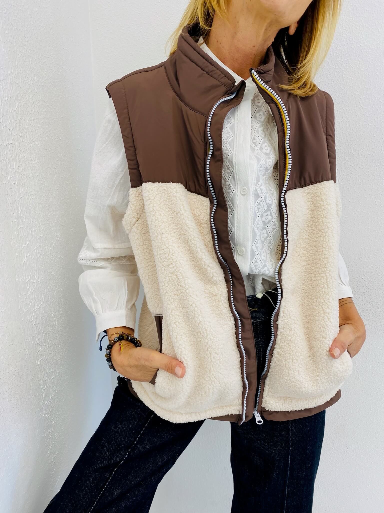 Ce gilet sans manches allie style et fonctionnalité. Parfait pour la mi-saison, il combine un tissu sherpa ultra doux et une matière déperlante sur le haut pour une protection optimale. Sa coupe droite et son col montant assurent confort et chaleur avec une touche sport chic.