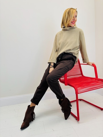 Porté ici dans sa version camel, rentré légèrement dans un pantalon fluide chocolat et associé à des bottines à franges, il crée un look bohème chic et raffiné.