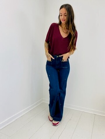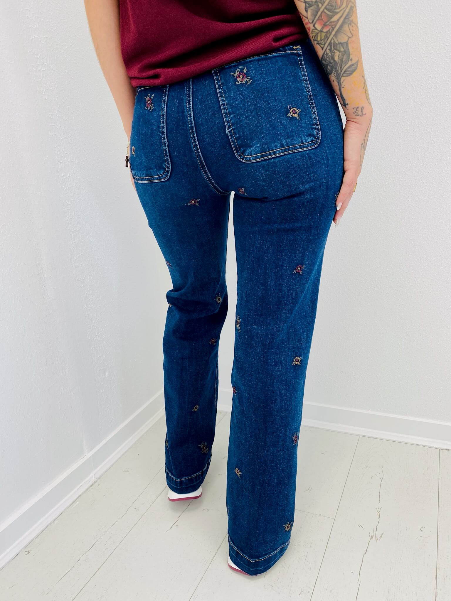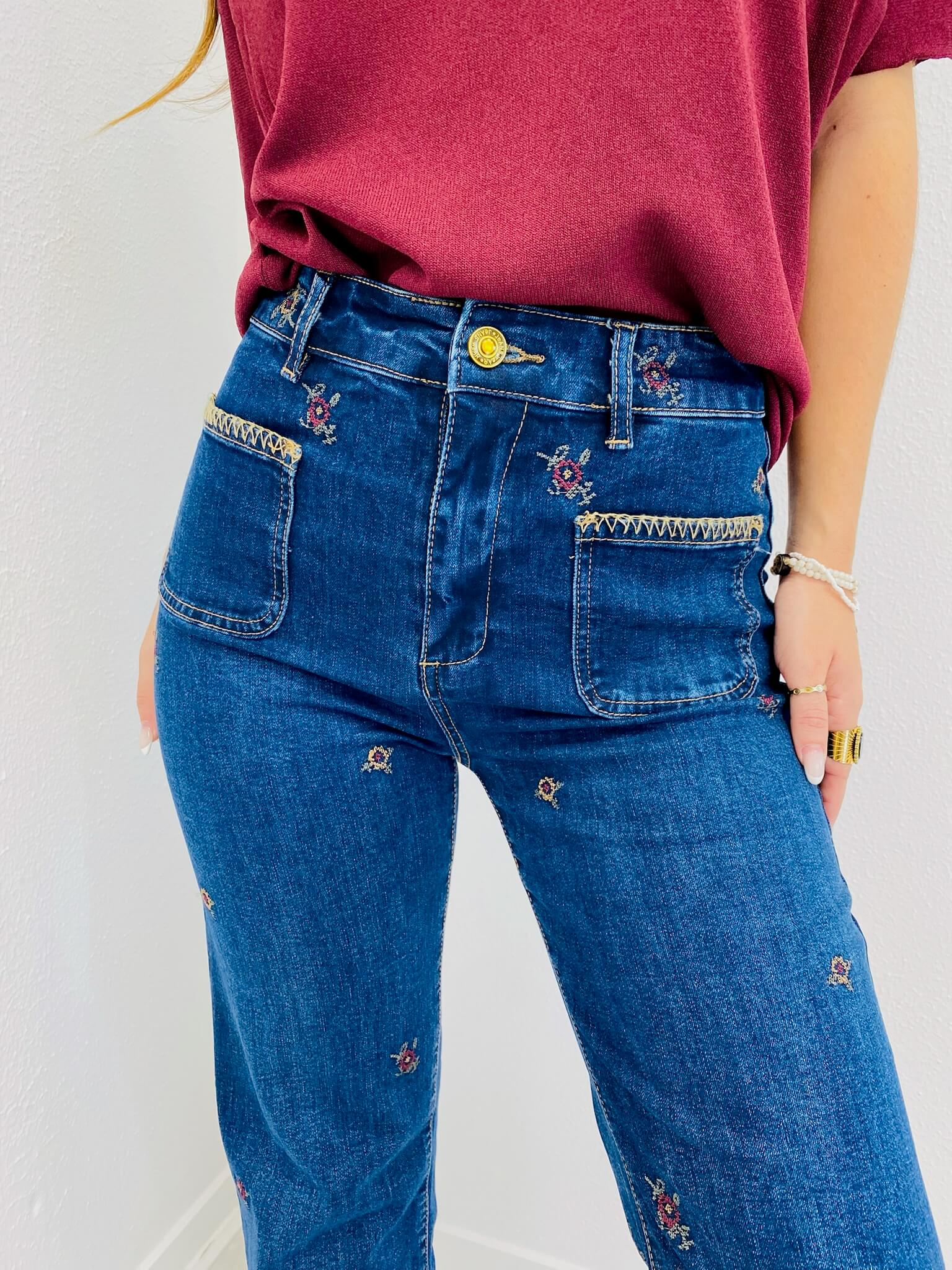 Jean coupe large à taille haute, orné de petites broderies florales délicates disséminées sur l’ensemble de la pièce. Poches plaquées sur l’avant avec finitions contrastantes décoratives et fermeture par bouton et zip. Tissu confortable et légèrement extensible pour un ajustement optimal. Idéal pour un look casual-chic avec une touche originale.