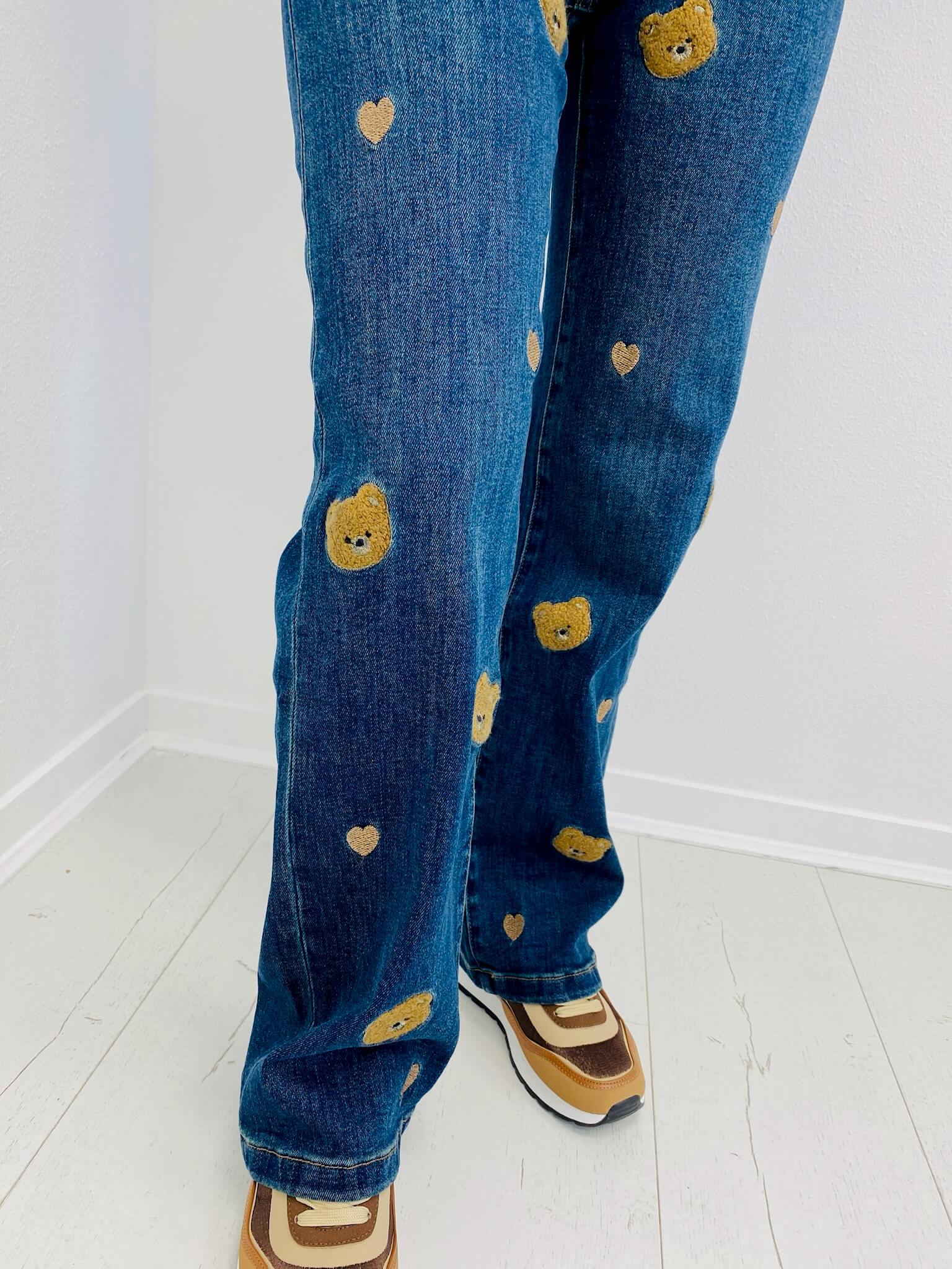 Jean original coupe wide leg, offrant une silhouette allongée et tendance. Modèle décoré de petits motifs brodés en forme de nounours et de cœurs sur l’avant, pour une touche ludique et féminine. Taille haute pour un maintien optimal et confort au quotidien.