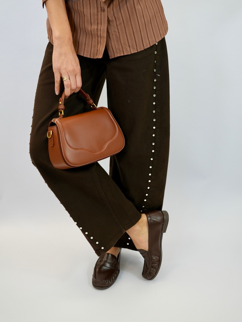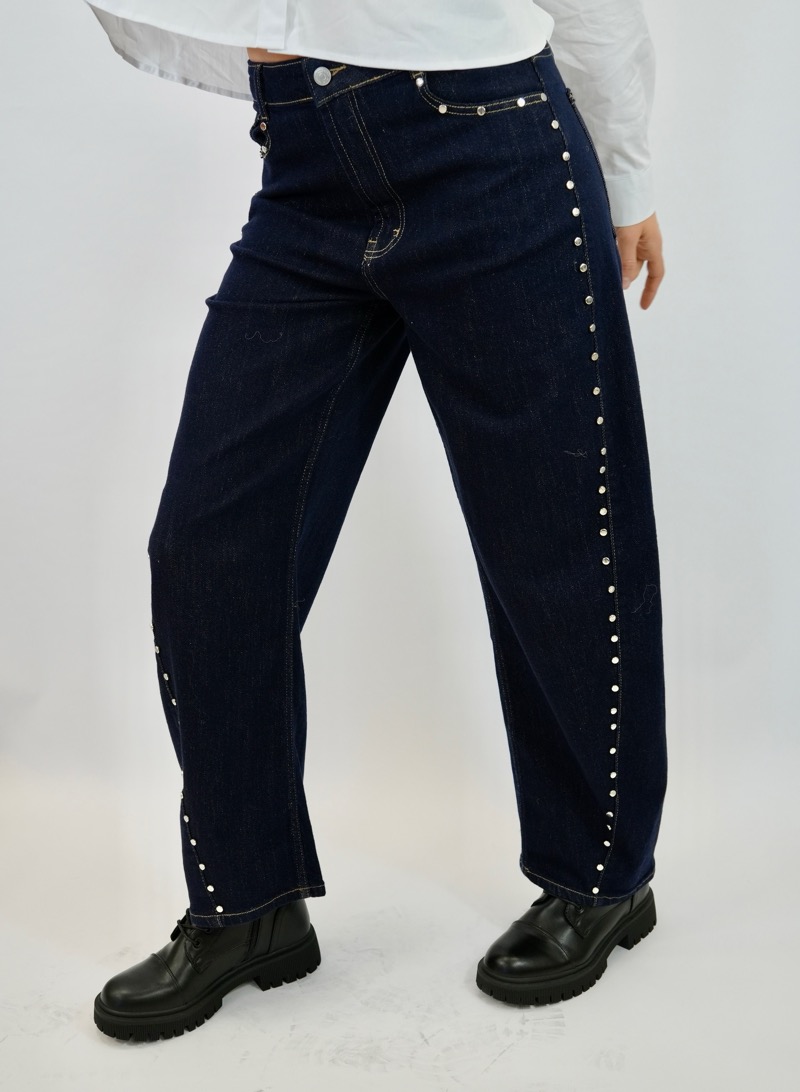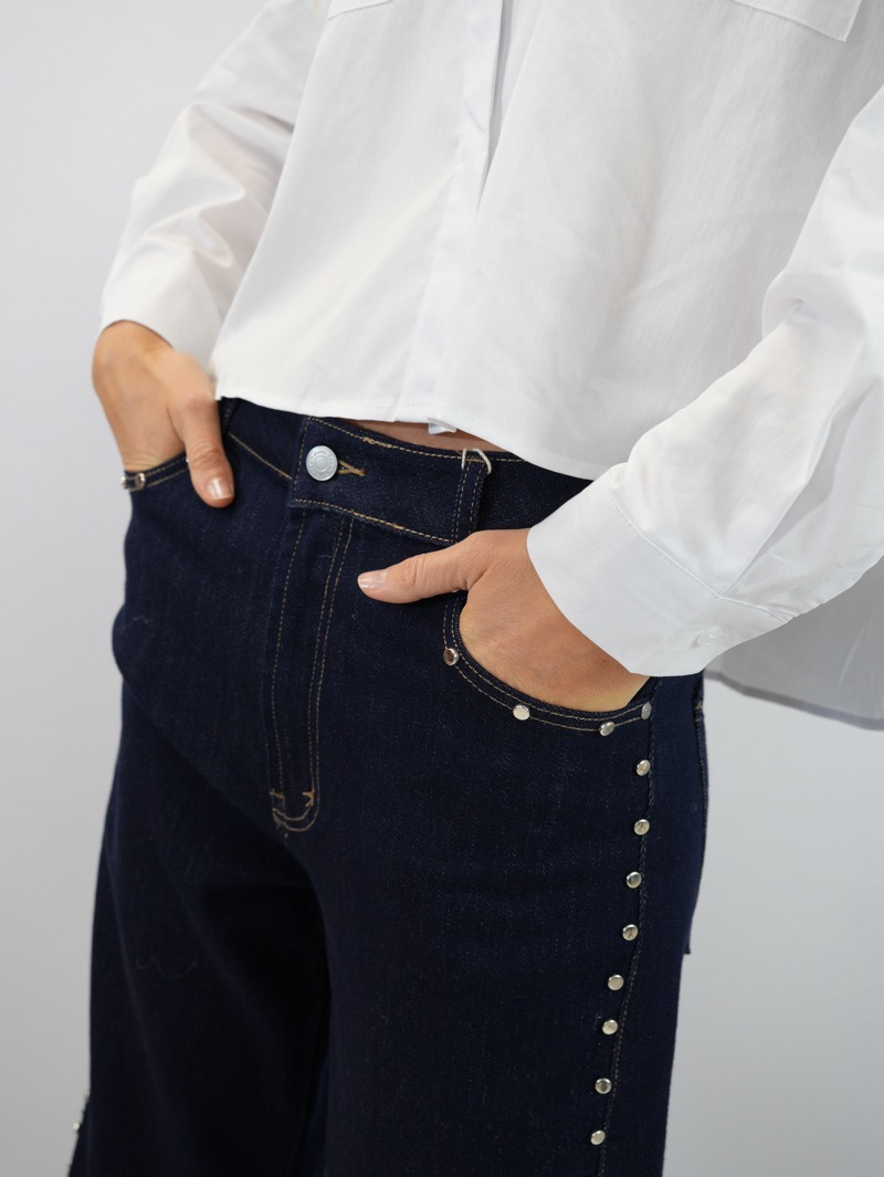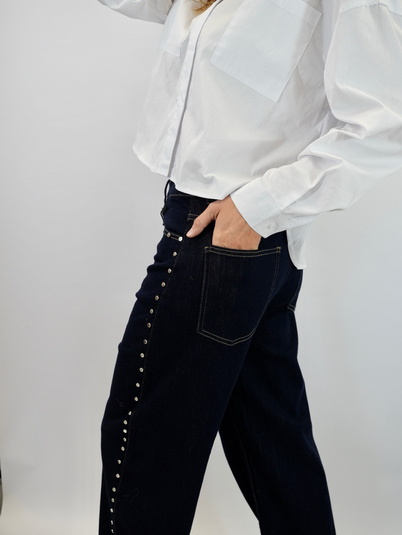 Ce jean revisite la coupe droite classique avec un détail mode ultra-tendance : une rangée de clous métalliques qui longe toute la jambe, du haut jusqu’à l’ourlet, créant un effet élancé et moderne.