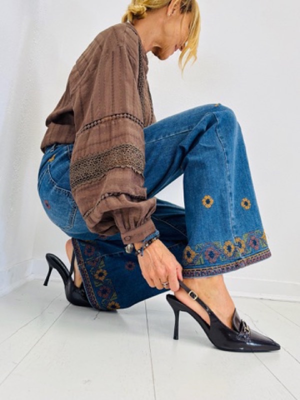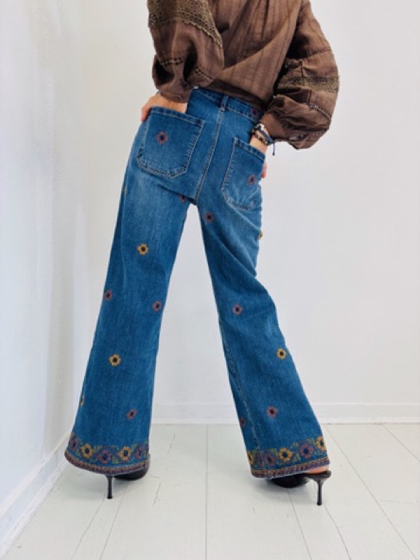 n jean au style bohème assumé, avec sa coupe large et ses jolies broderies colorées réparties sur les jambes et en bas. Sa taille haute et sa coupe évasée flattent toutes les silhouettes. Idéal pour un look folk-chic avec une blouse romantique ou un pull oversize.