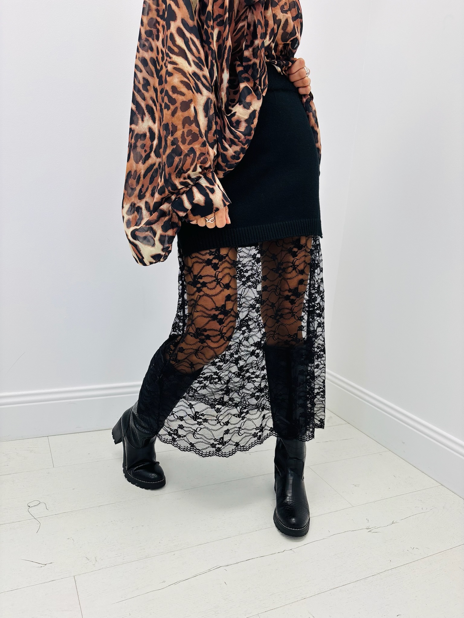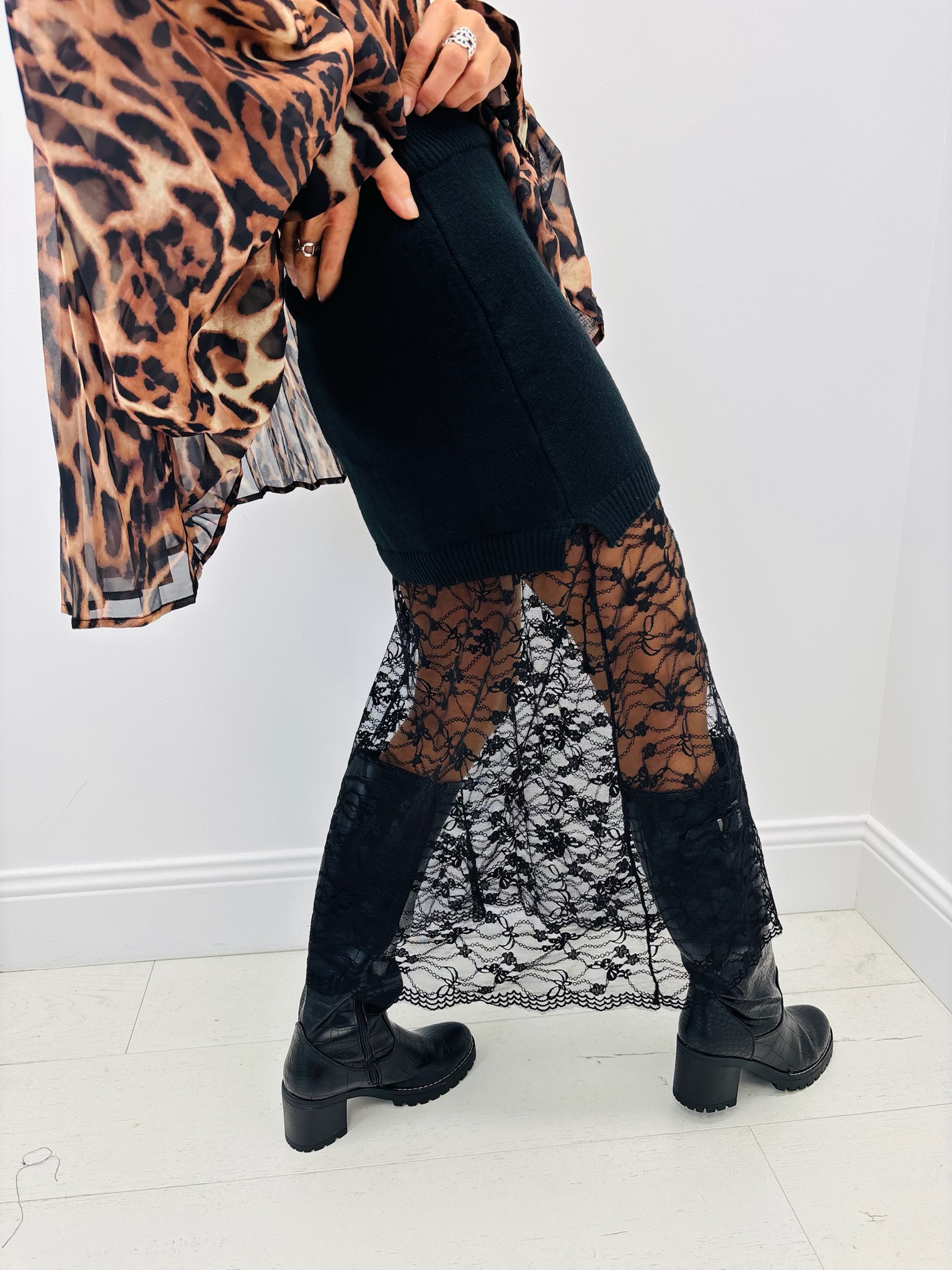 Jupe longue bimatière : maille douce + dentelle florale ajourée