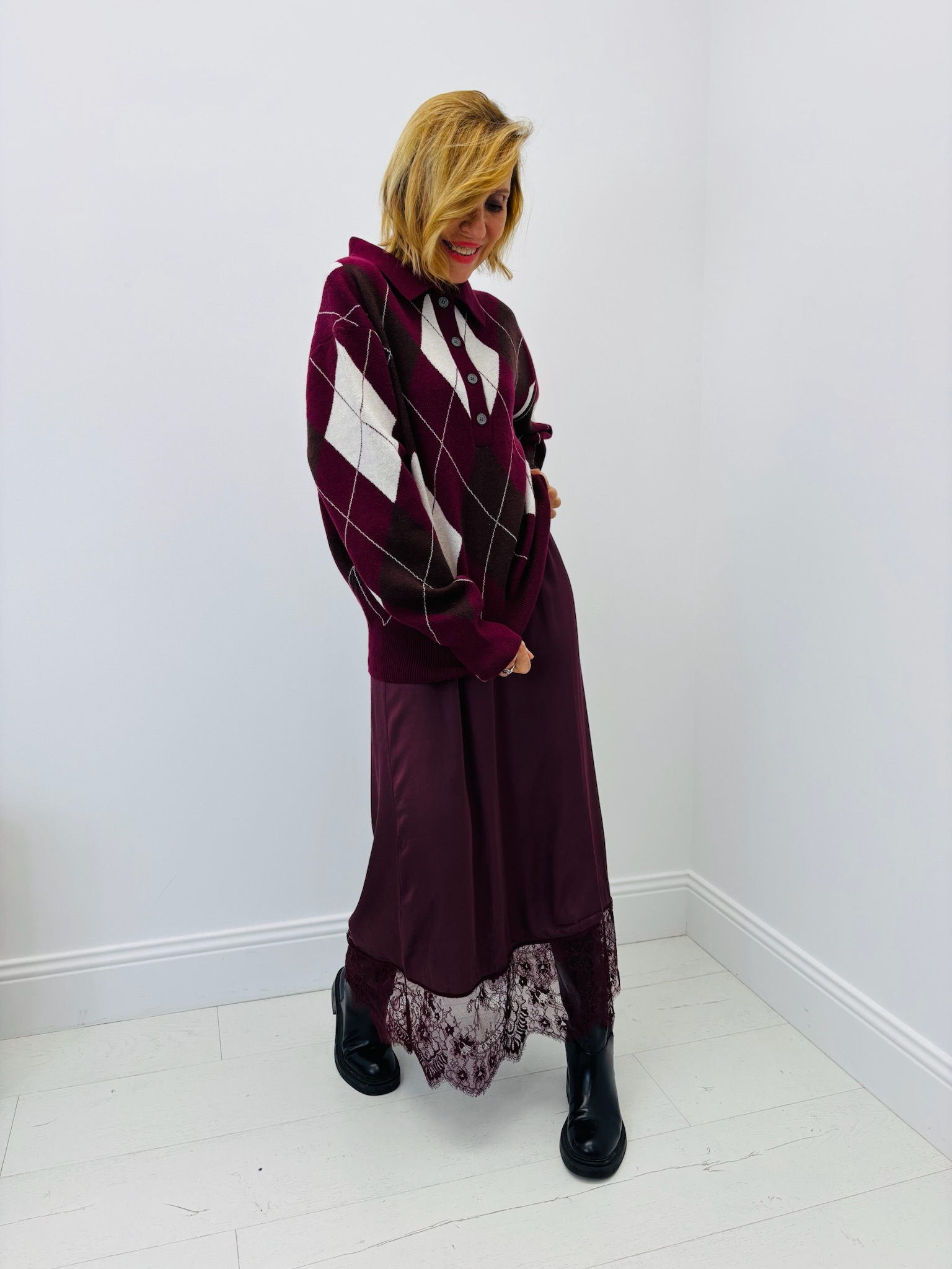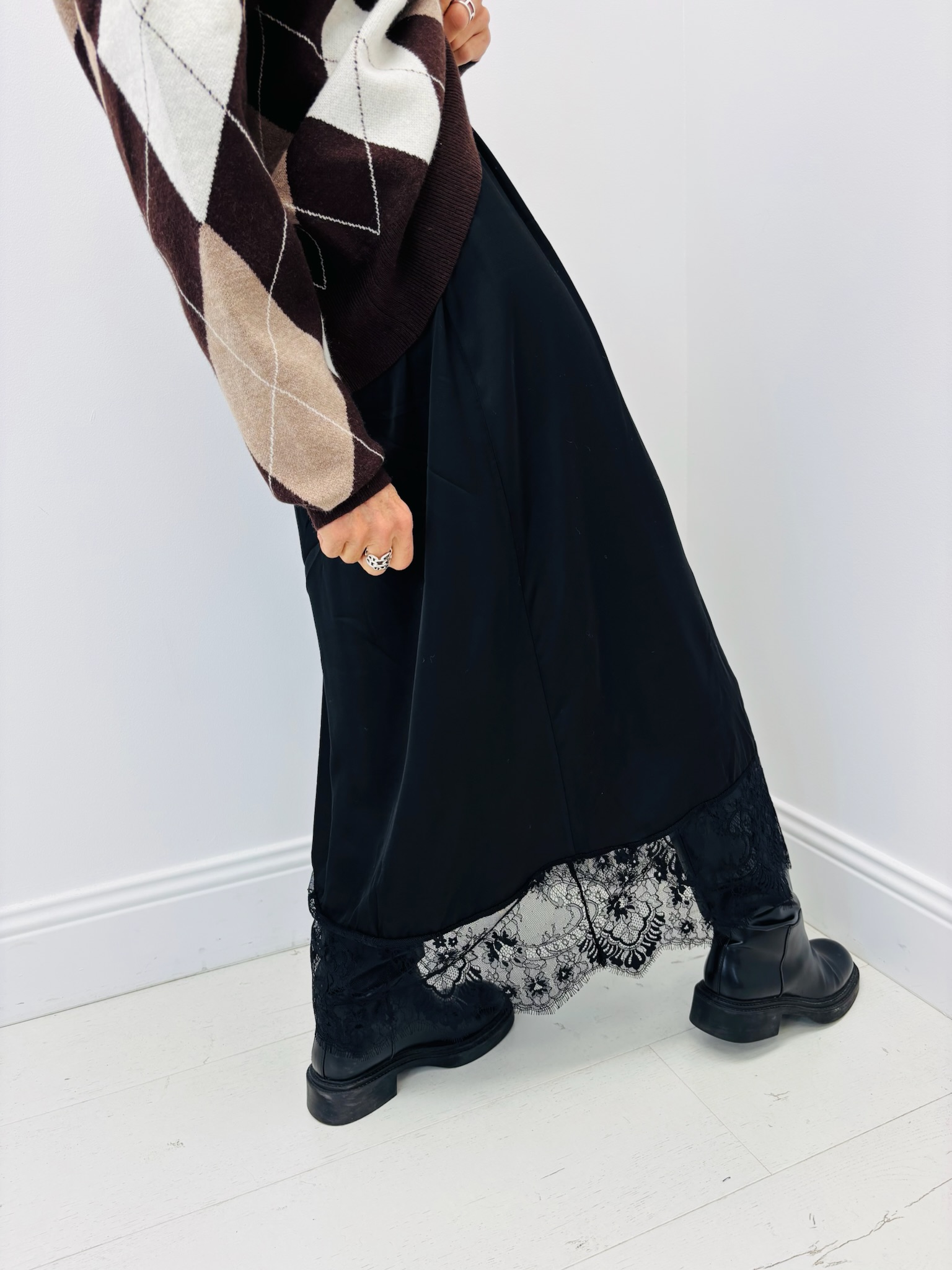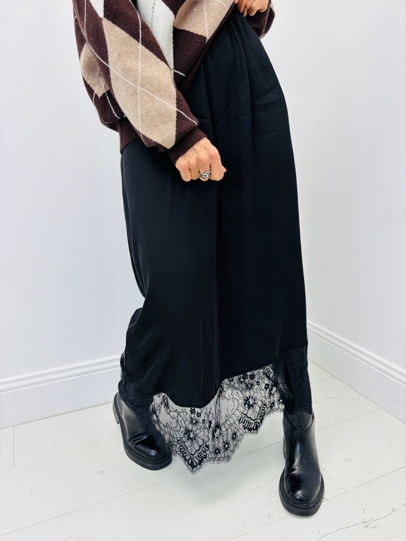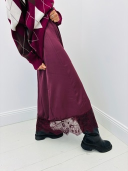Une jupe fluide et féminine à la brillance subtile, rehaussée d’une délicate bordure en dentelle raffinée.