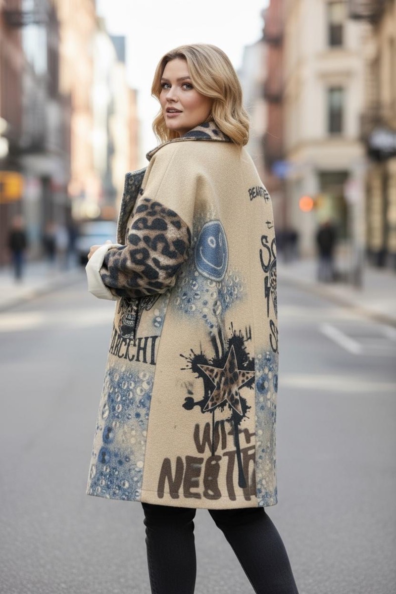 Un manteau original et féminin qui mêle élégance et confort. Sa matière effet laine bouillie offre une belle chaleur, tandis que son imprimé artistique mêlant motifs abstraits et fleurs apporte une touche romantique et contemporaine. Sa coupe droite et ample convient parfaitement aux silhouettes du 44 au 52.