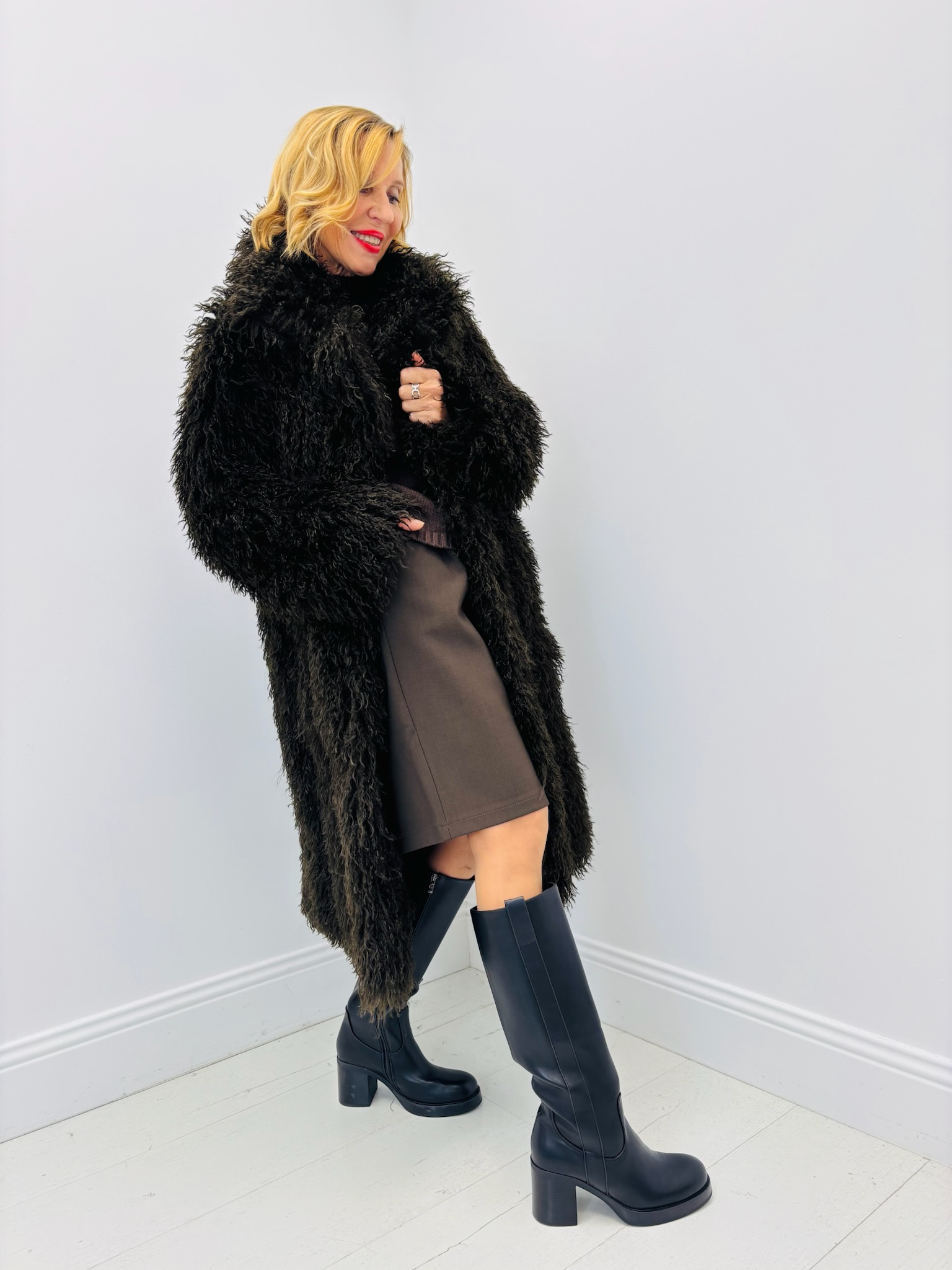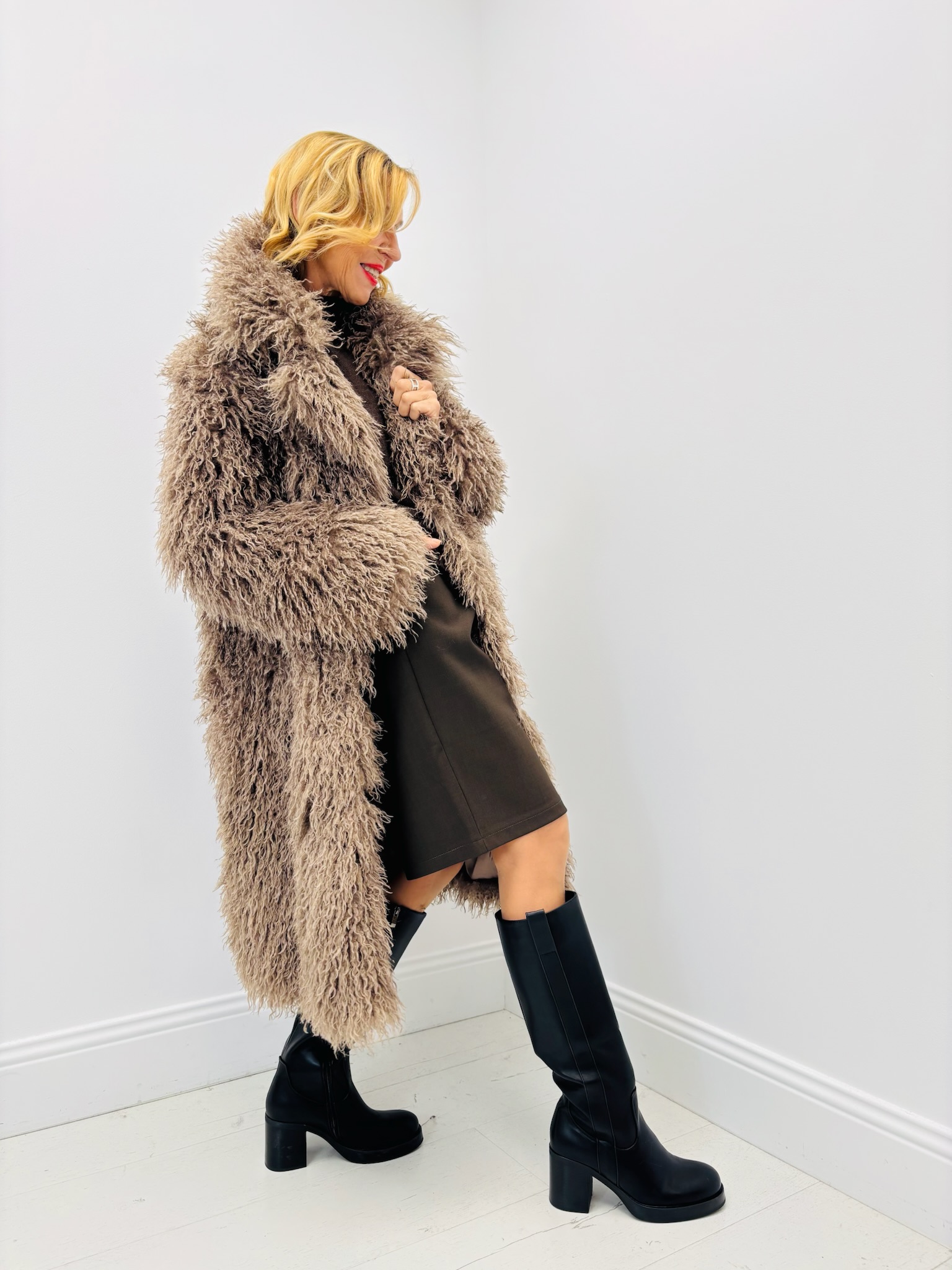 Ce modèle en fausse fourrure longue et duveteuse séduit par sa texture moelleuse et son allure sophistiquée.