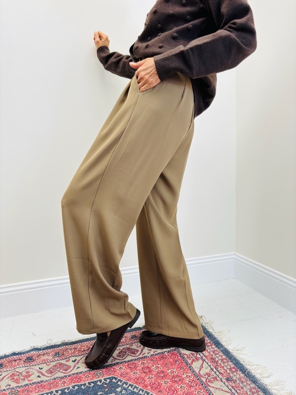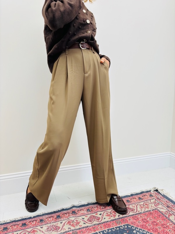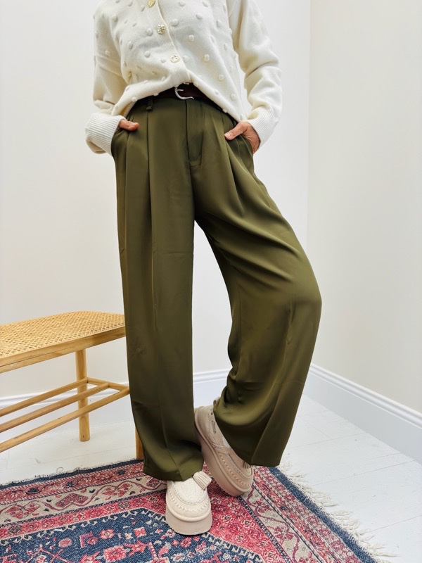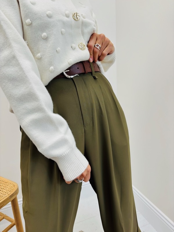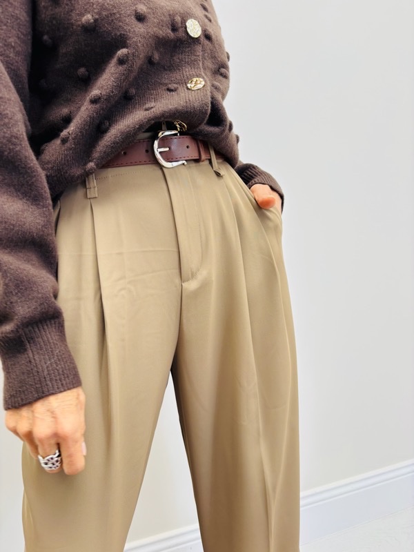 Un pantalon élégant et fluide, doté d’une ceinture intégrée ton sur ton qui souligne la taille.