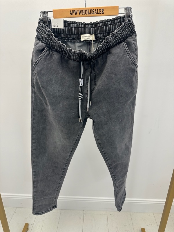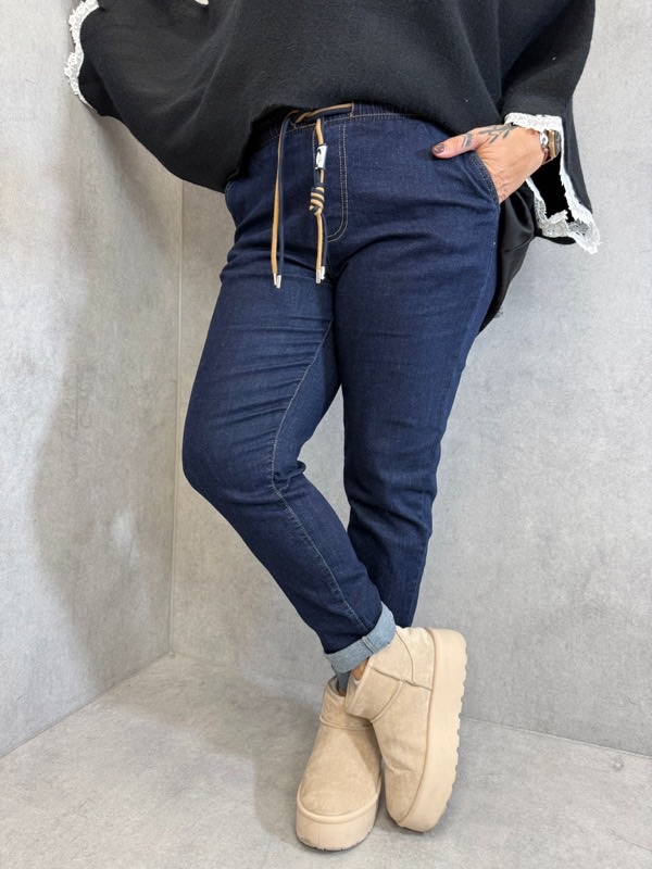 Ce pantalon façon jean combine parfaitement style et confort pour un look moderne au quotidien. Sa matière souple et extensible épouse les formes sans les serrer, tandis que sa ceinture élastiquée avec lien fantaisie apporte une touche tendance et pratique.