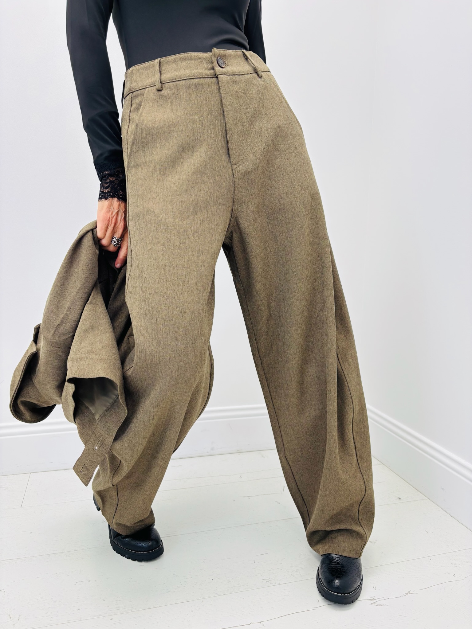 Sa taille mi-haute, sa jambe large et ses poches latérales en font une pièce polyvalente à la fois chic et décontractée.