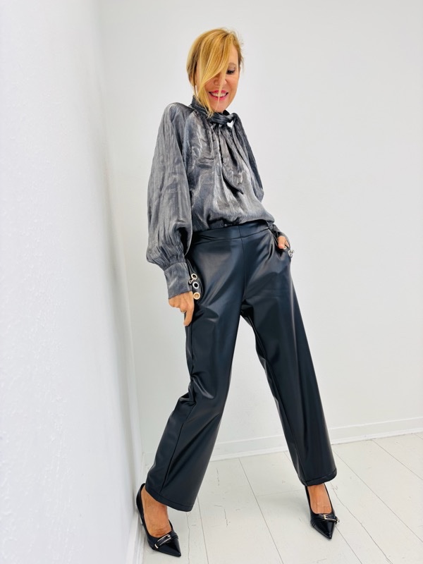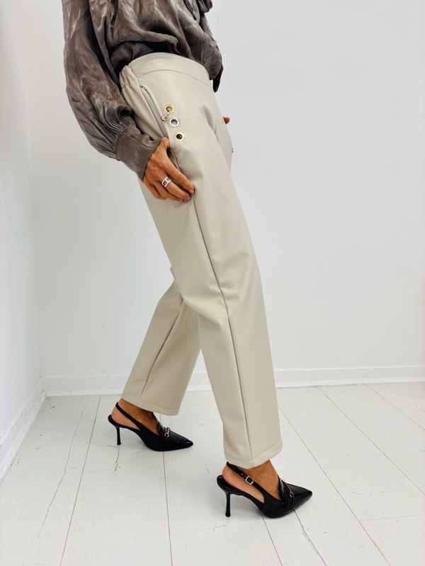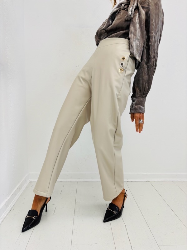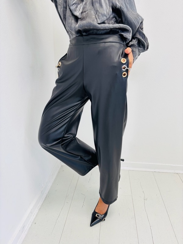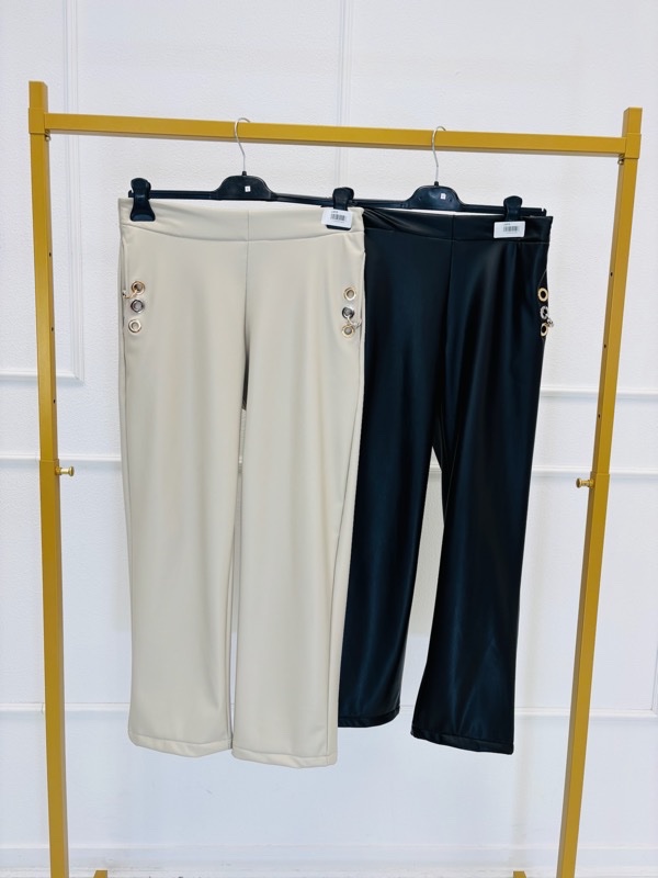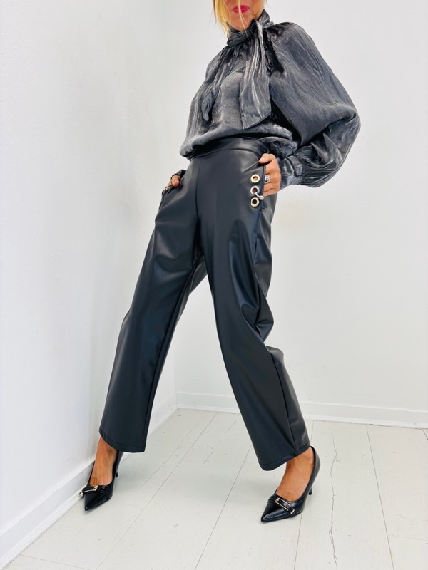 Un pantalon à l’allure affirmée, parfait pour structurer un look chic, urbain ou rock. Sa coupe sobre est sublimée par des détails métalliques ultra-stylés sur les hanches, apportant une touche moderne et audacieuse.