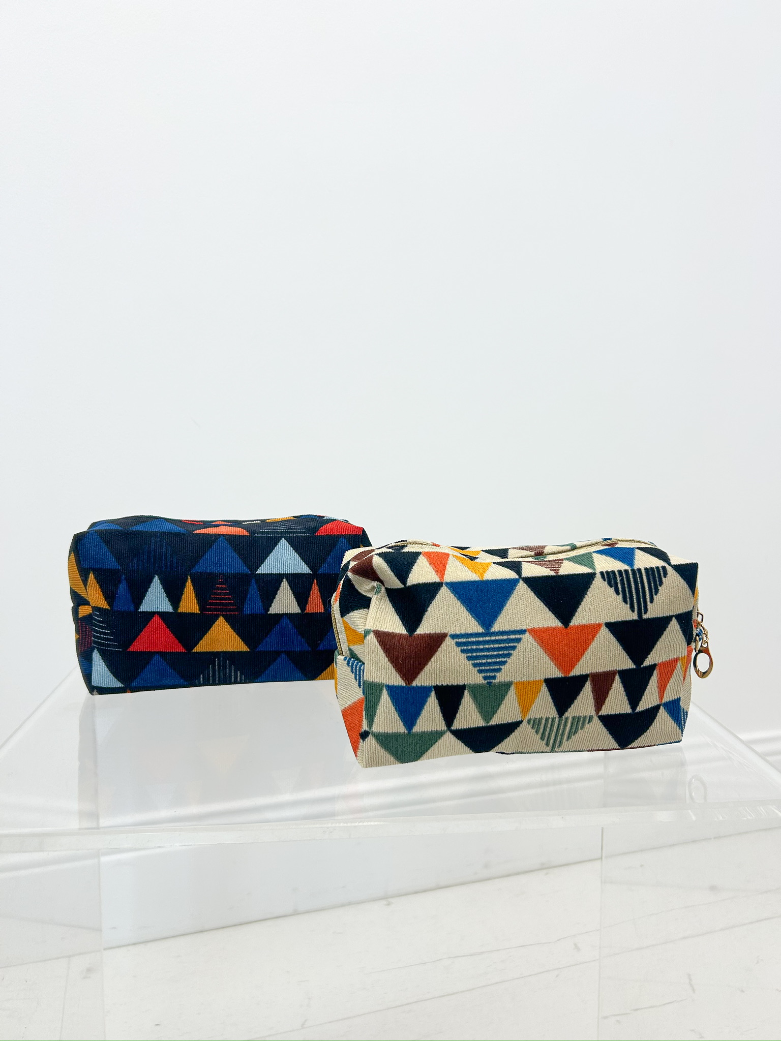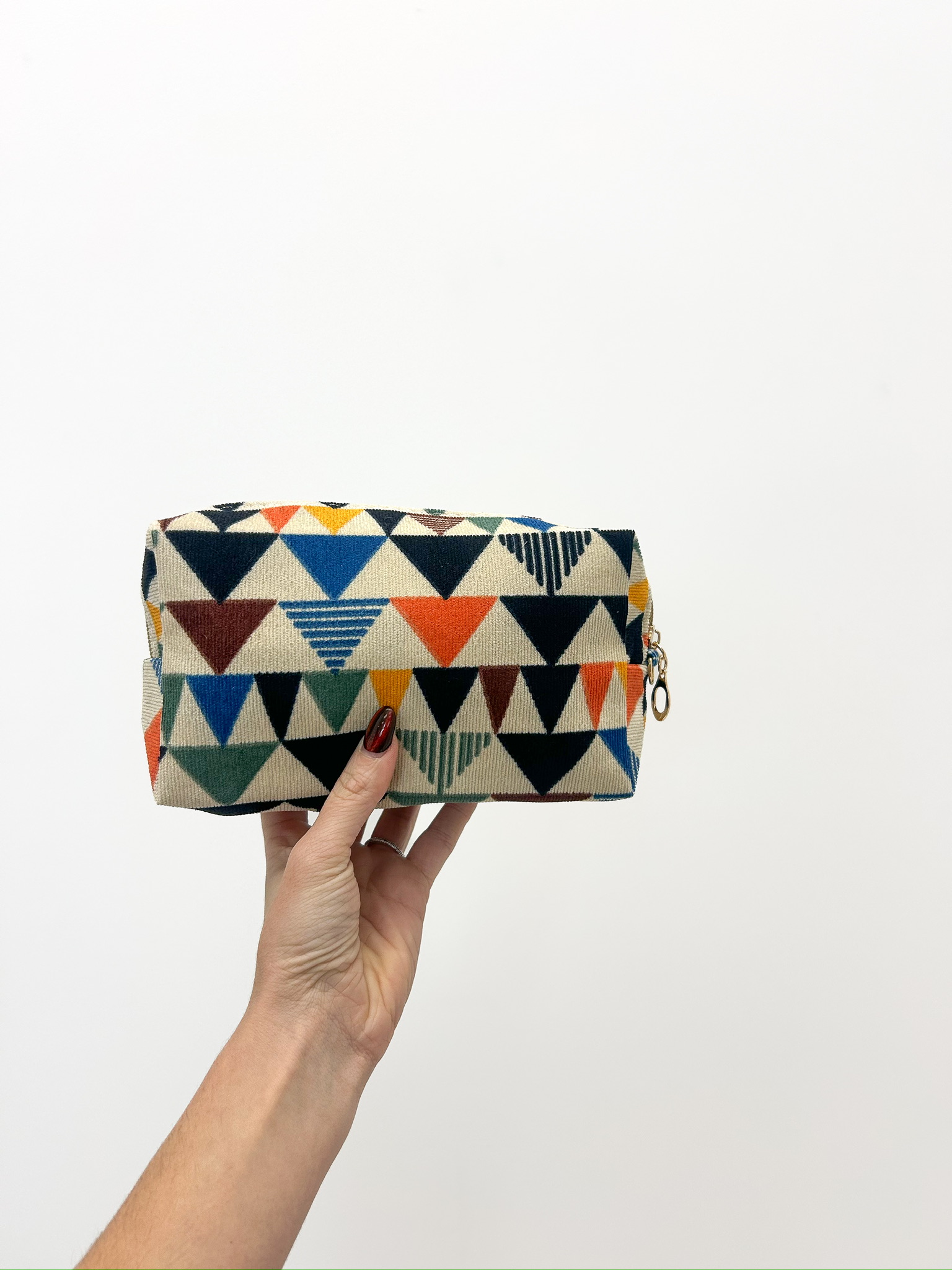 Cette pochette à la forme cubique séduit par son design géométrique tendance et son jeu de couleurs harmonieux. Conçue dans un tissu doux mais structuré, elle offre une tenue parfaite tout en restant légère et facile à transporter. Son motif de triangles multicolores apporte une touche moderne et dynamique, idéale pour accompagner toutes vos tenues du quotidien.