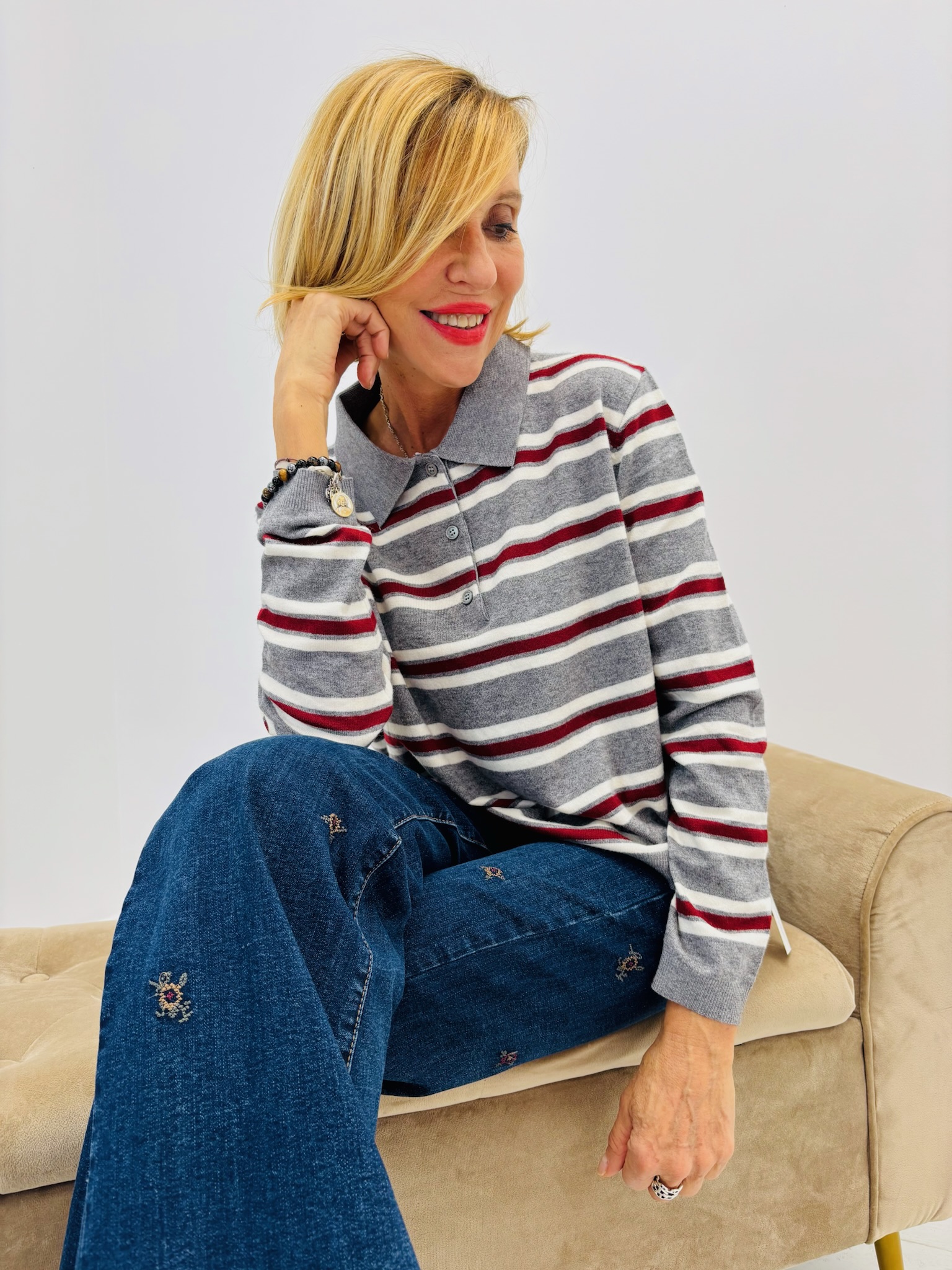 Coloris disponibles : Écru à rayures rose / Gris à rayures bordeaux