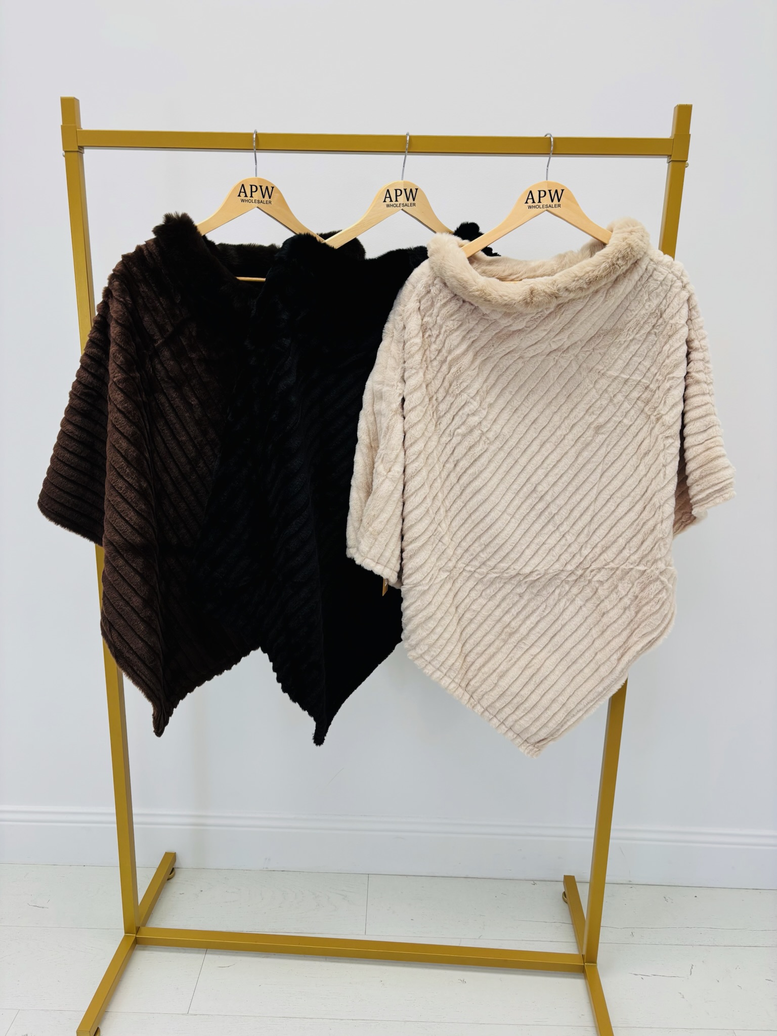 Un poncho doudou à prix canon 💥 ! Confectionné dans une fausse fourrure moelleuse, ce modèle apporte chaleur et élégance pour affronter l’hiver avec style. Son toucher velours et son col montant en font une pièce cocooning incontournable.