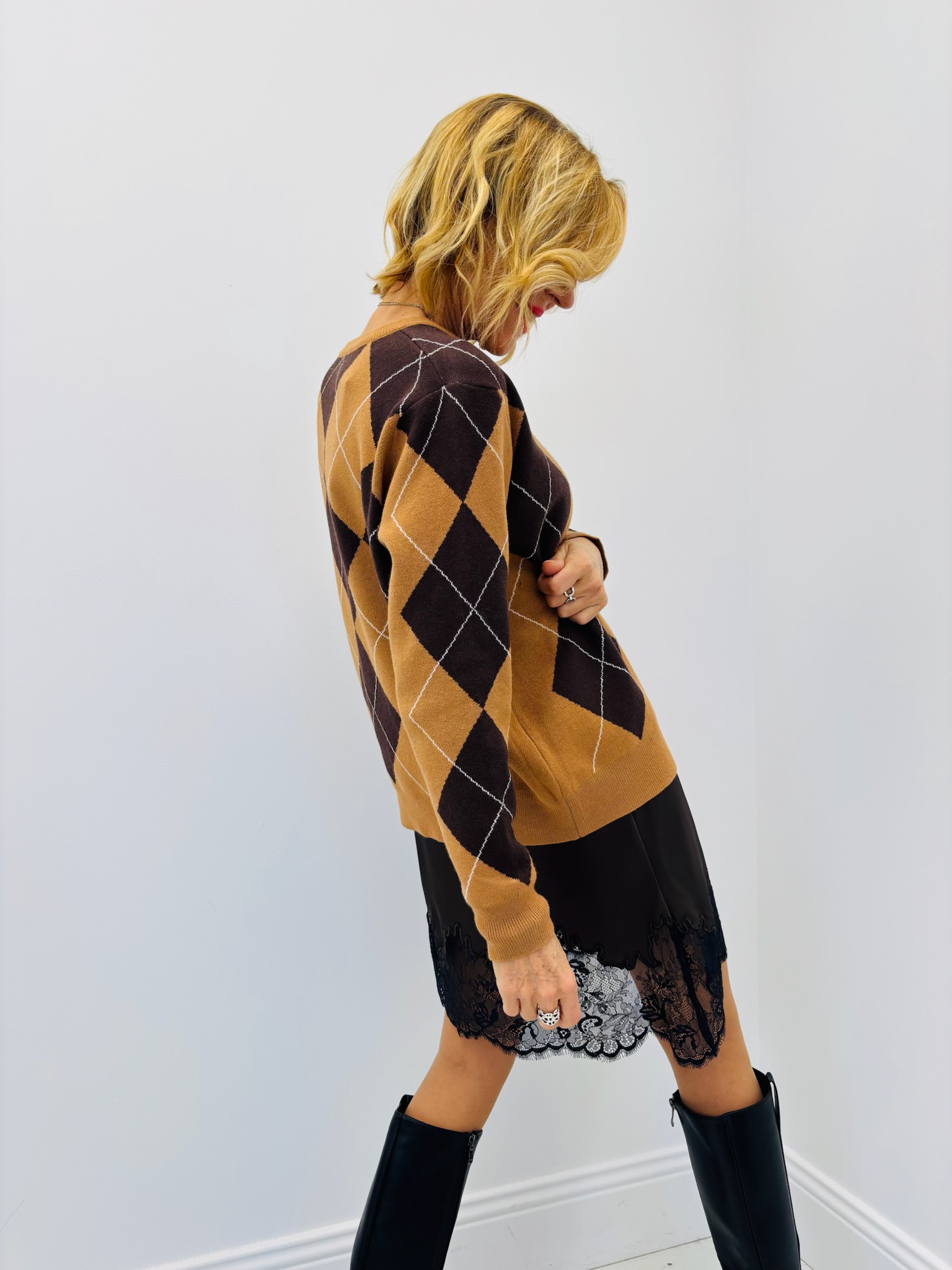 Porté ici avec une jupe satinée chocolat et des bottes hautes noires, le pull crée un look moderne et féminin, à la fois confortable et chic.