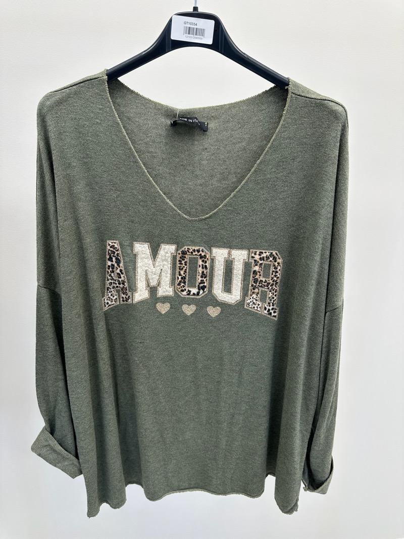 Un coup de cœur assuré pour ce pull doux et féminin, sublimé par son inscription “AMOUR” en relief texturé et imprimé animalier. Sa maille fluide et sa coupe ample en font une pièce confortable et flatteuse, parfaite pour les silhouettes rondes. Le col V souligne délicatement le décolleté, tandis que les manches longues retroussables apportent une touche décontractée et tendance. Un essentiel du dressing casual chic, signé Made in Italy.